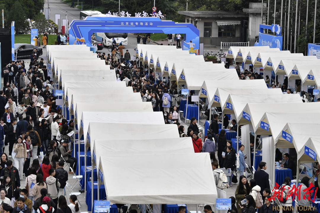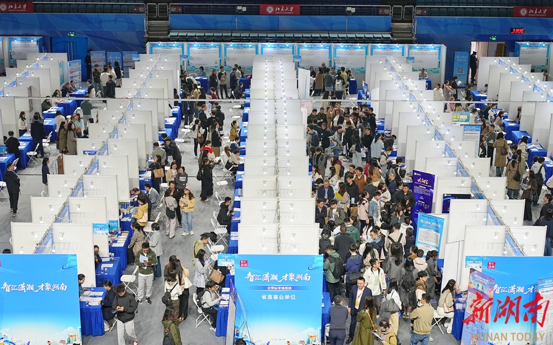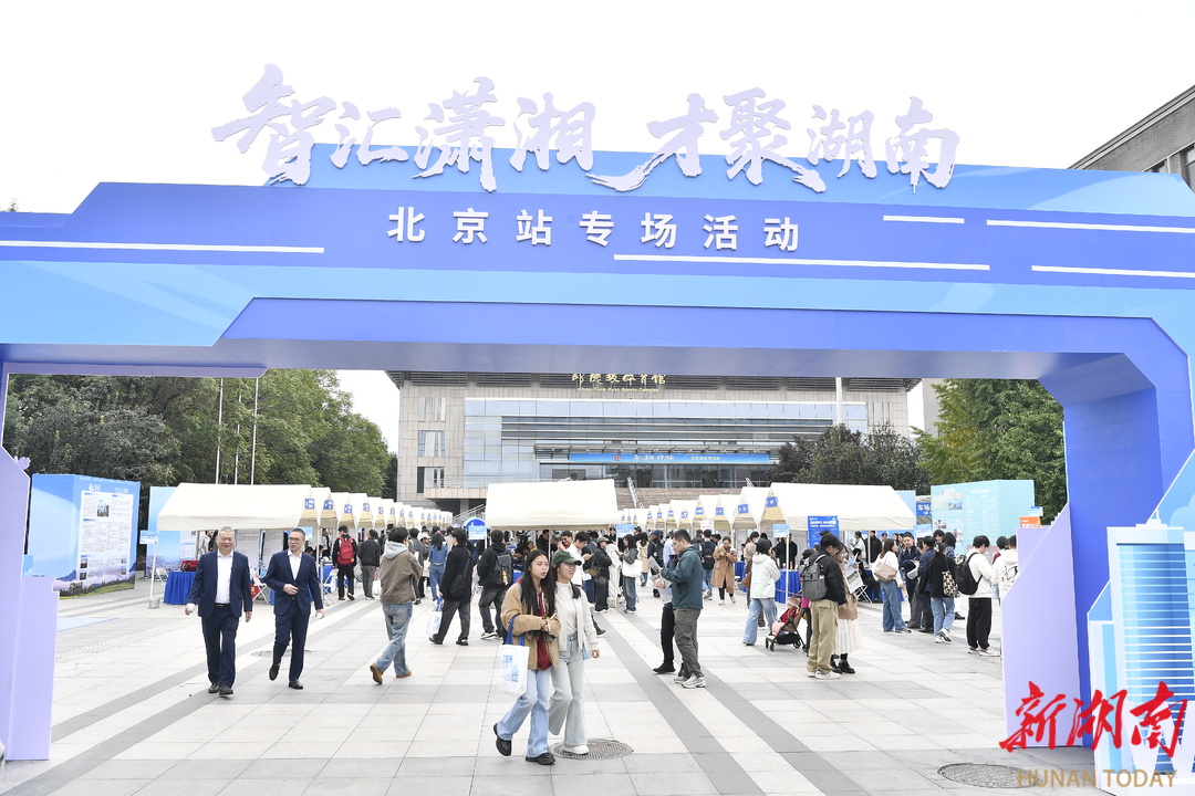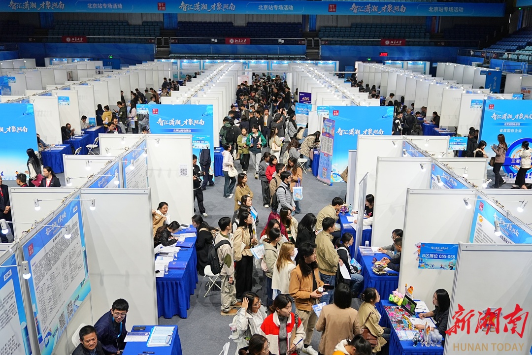 10月12日,“智汇潇湘 才聚湖南”北京站专场招聘活动推介大会在北京大学举行,现场发布了岗位需求目录。湖南近500家优质用人单位,超1.47万个岗位进京“招贤纳士”,彰显“求贤若渴、诚纳英才”的诚意。图为专场招聘活动现场。 湖南日报全媒体记者 傅聪 童迪 邹尚奇 摄影报道