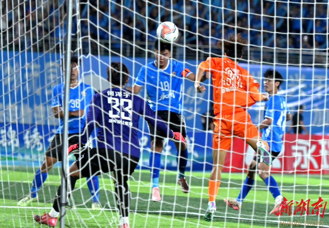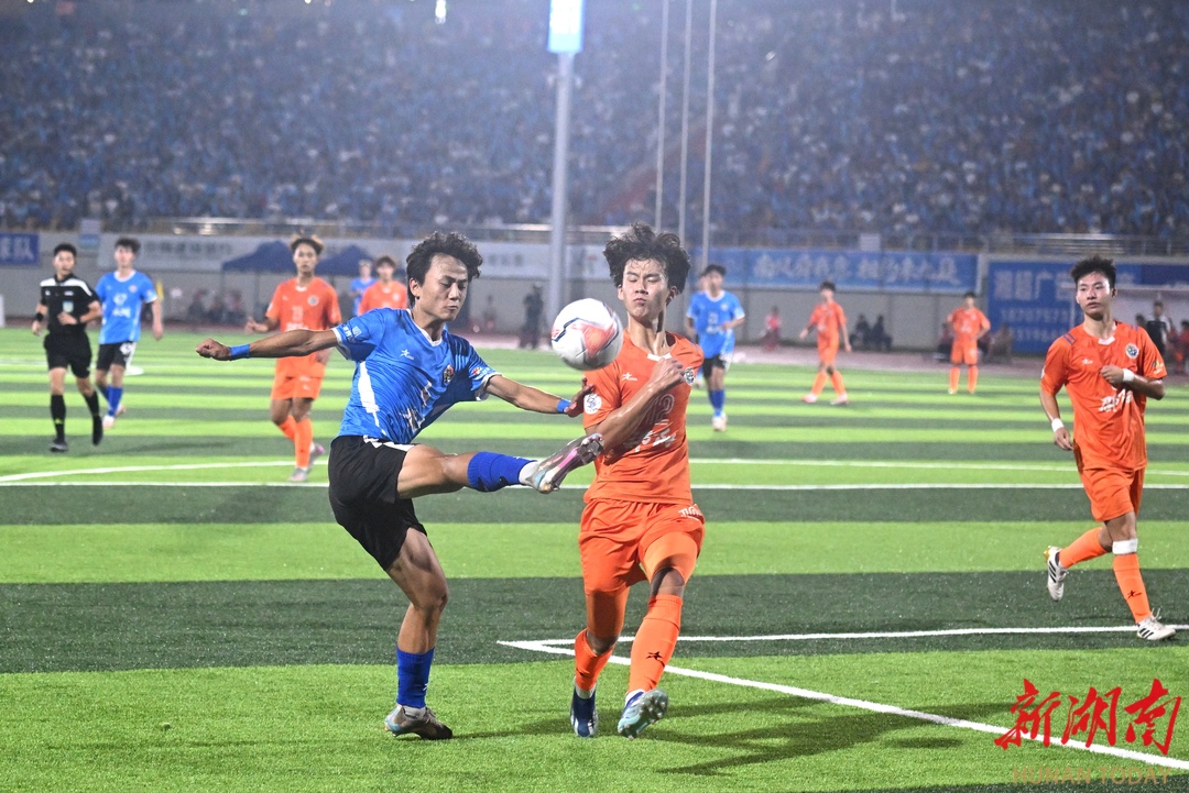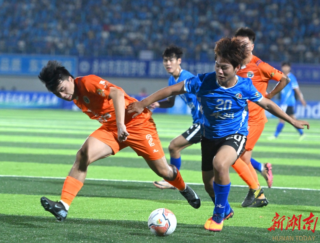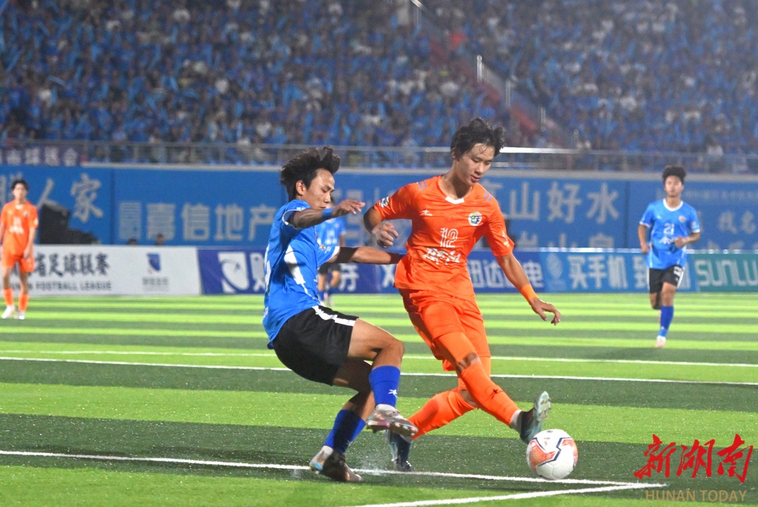 10月12日晚,永州市体育场,永州队(蓝色)与邵阳队球员在比赛中奋力拼抢。当天,2025“湘超联赛”第五轮比赛火热进行,永州队主场迎战邵阳队。最终,永州队4比1战胜邵阳队,取得三分。湖南日报全媒体记者 郭立亮 通讯员 周文晋 摄影报道
