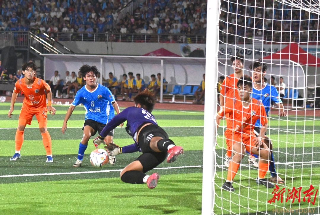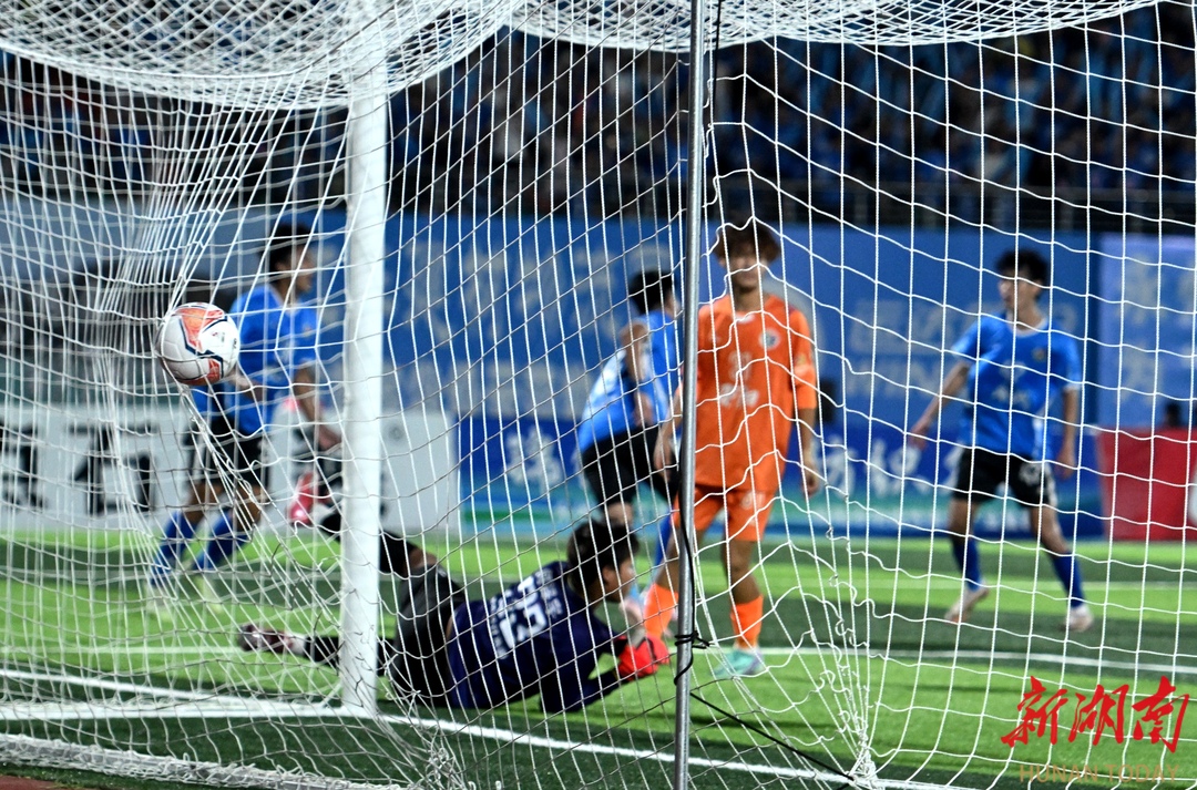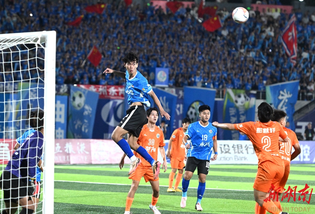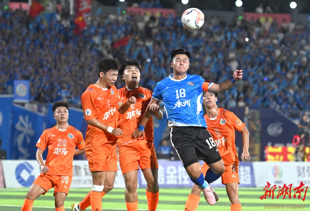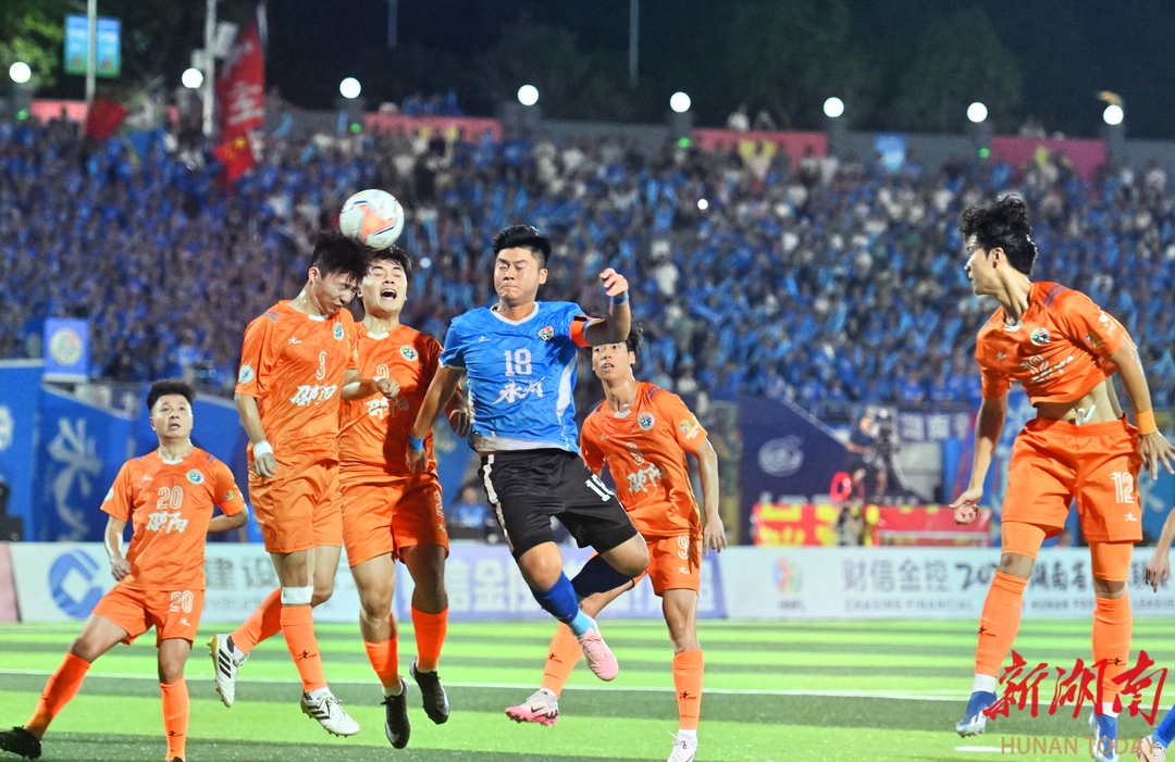 10月12日晚,永州市体育场,永州队(蓝色)与邵阳队球员在比赛中奋力拼抢。当天,2025“湘超联赛”第五轮比赛火热进行,永州队主场迎战邵阳队。最终,永州队4比1战胜邵阳队,取得三分。湖南日报全媒体记者 郭立亮 通讯员 周文晋 摄影报道