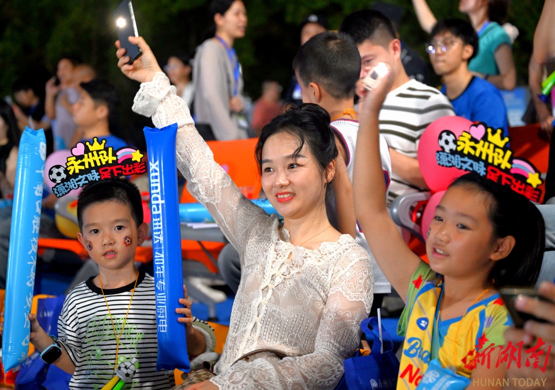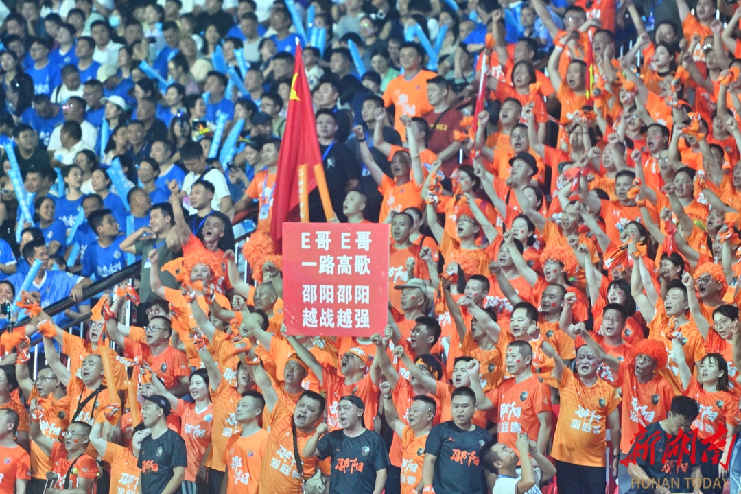 10月12日晚,永州市体育场,球迷在加油助威。当天,2025“湘超联赛”第五轮比赛火热进行,永州队主场迎战邵阳队。最终,永州队4比1战胜邵阳队,取得三分。湖南日报全媒体记者 郭立亮 通讯员 周文晋 摄影报道