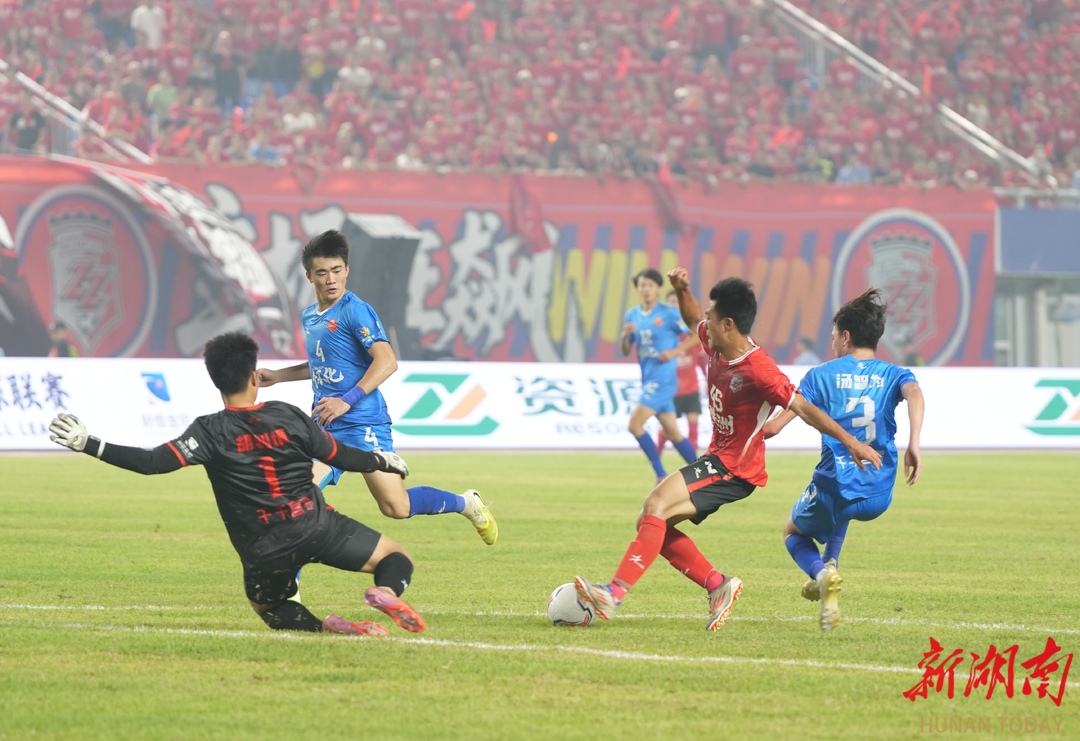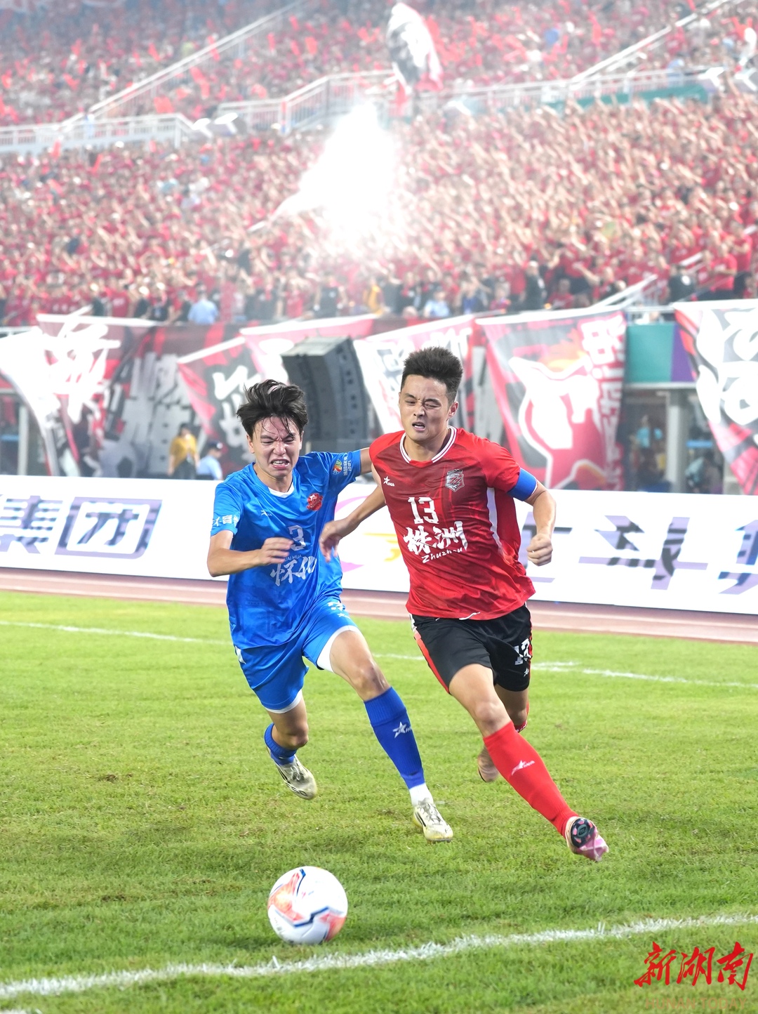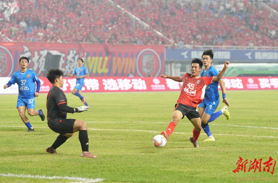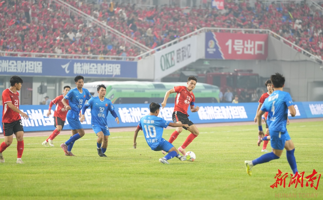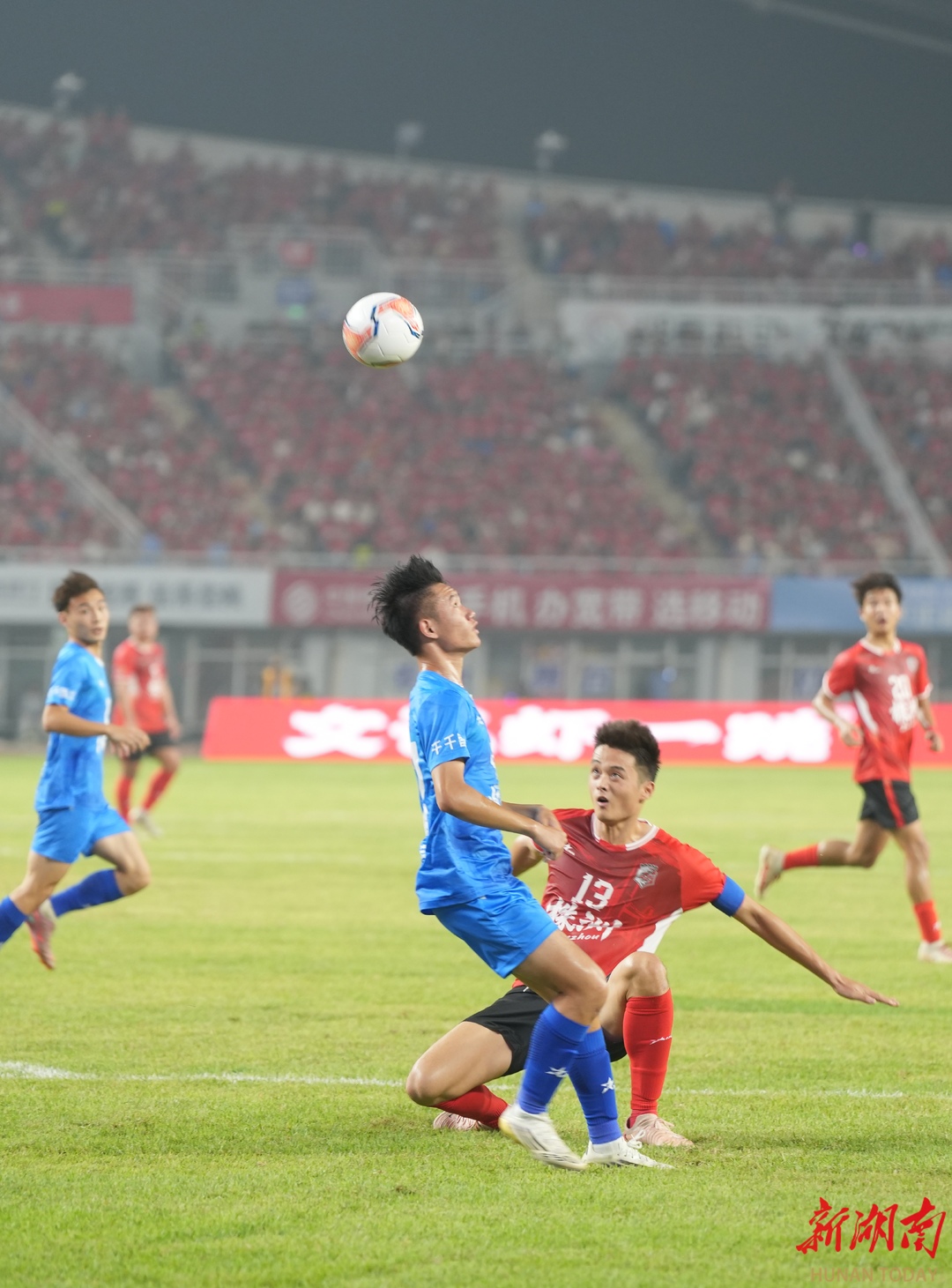 10月12日晚,株洲市体育中心体育场,两队球员在比赛中奋力拼抢。当天,2025湘超联赛进行第五轮比赛,株洲队(红)坐镇主场迎战怀化队。随着终场哨响,整场比赛结束,株洲队以3比0的比分战胜怀化队。 湖南日报全媒体记者 李健 摄