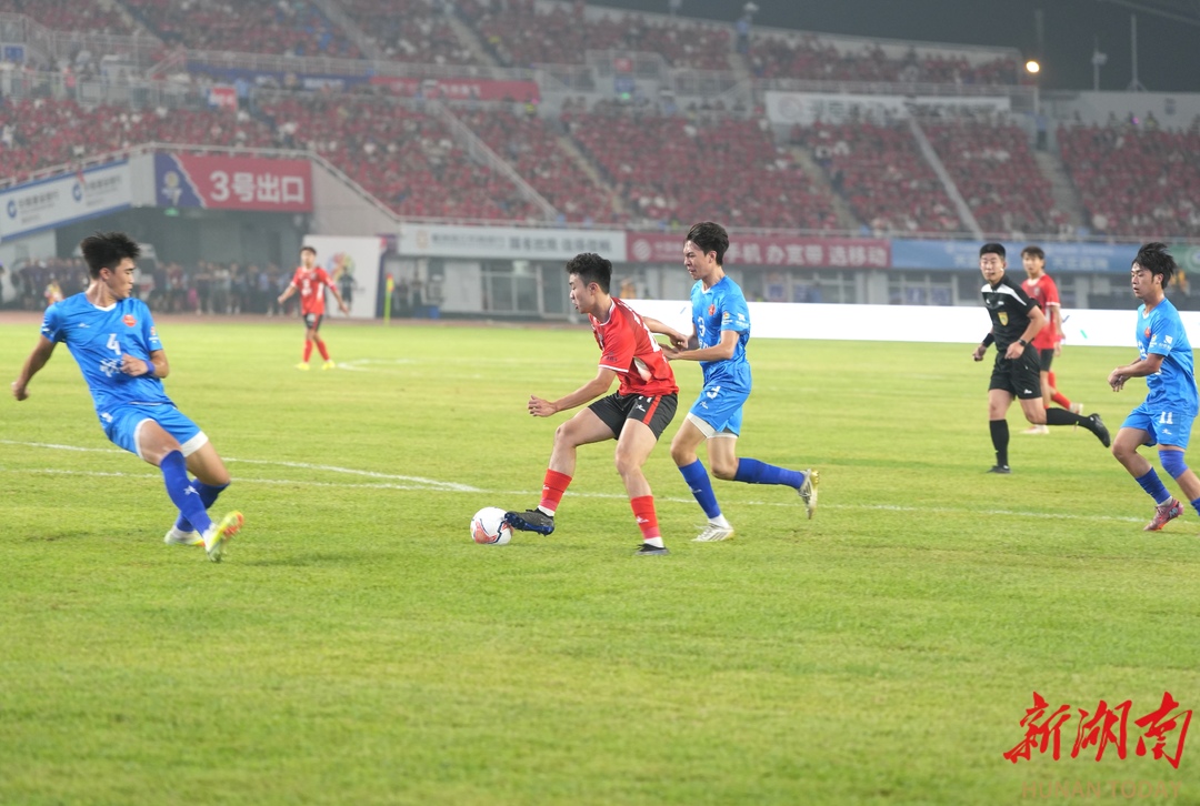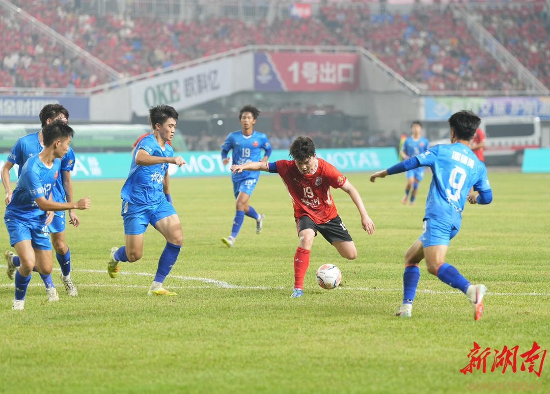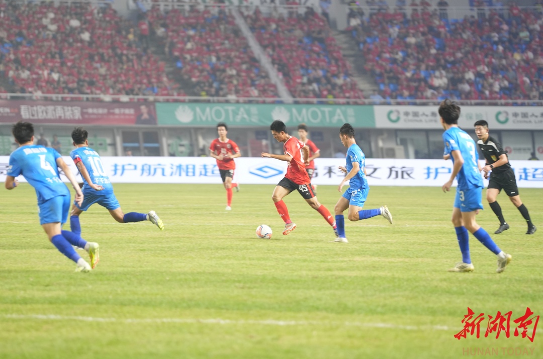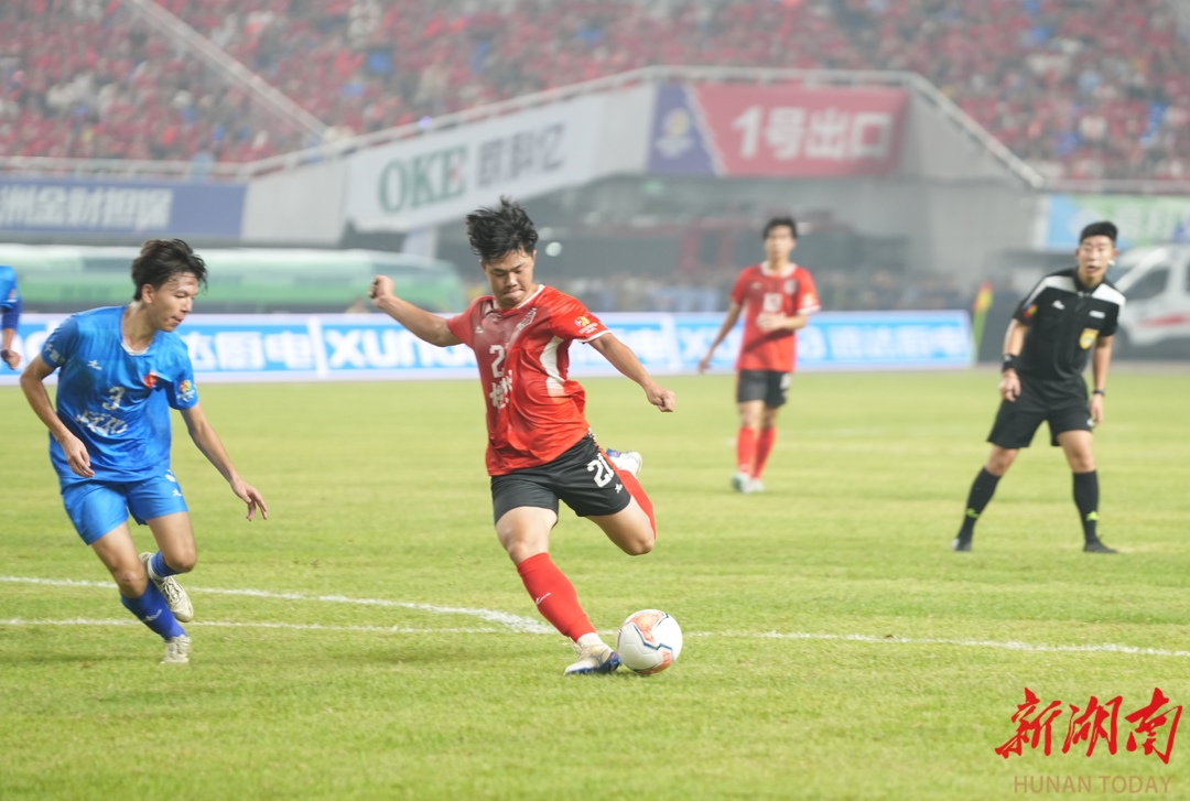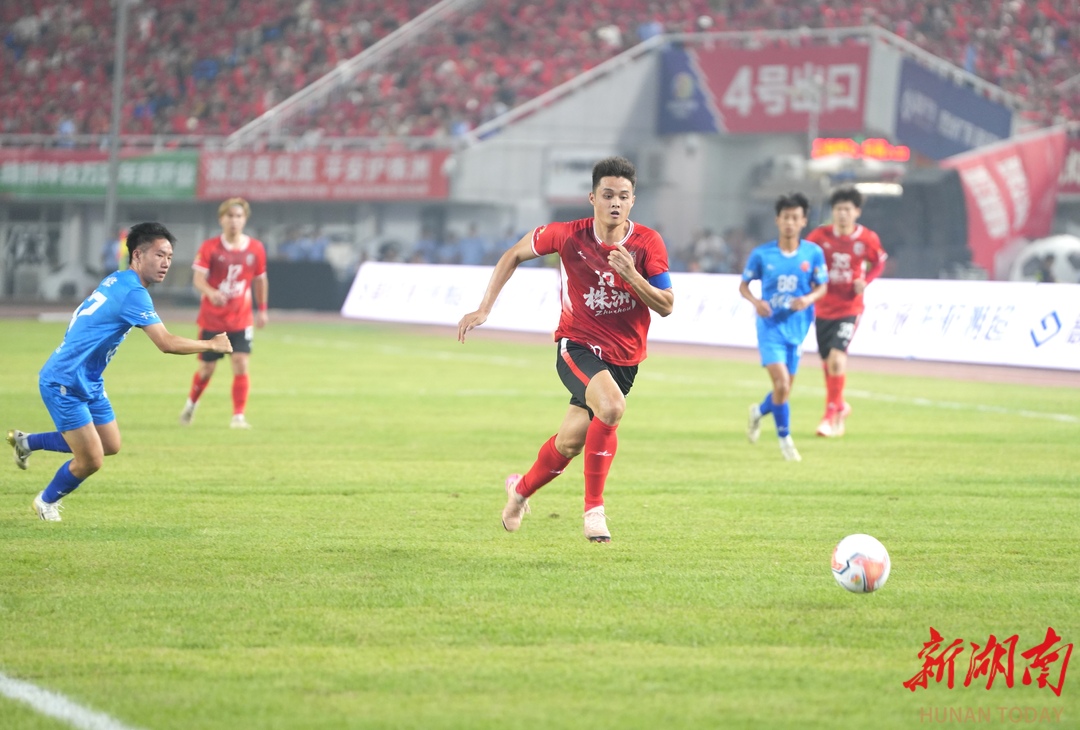 10月12日晚,株洲市体育中心体育场,两队球员在比赛中奋力拼抢。当天,2025湘超联赛进行第五轮比赛,株洲队(红)坐镇主场迎战怀化队。随着终场哨响,整场比赛结束,株洲队以3比0的比分战胜怀化队。 湖南日报全媒体记者 李健 摄