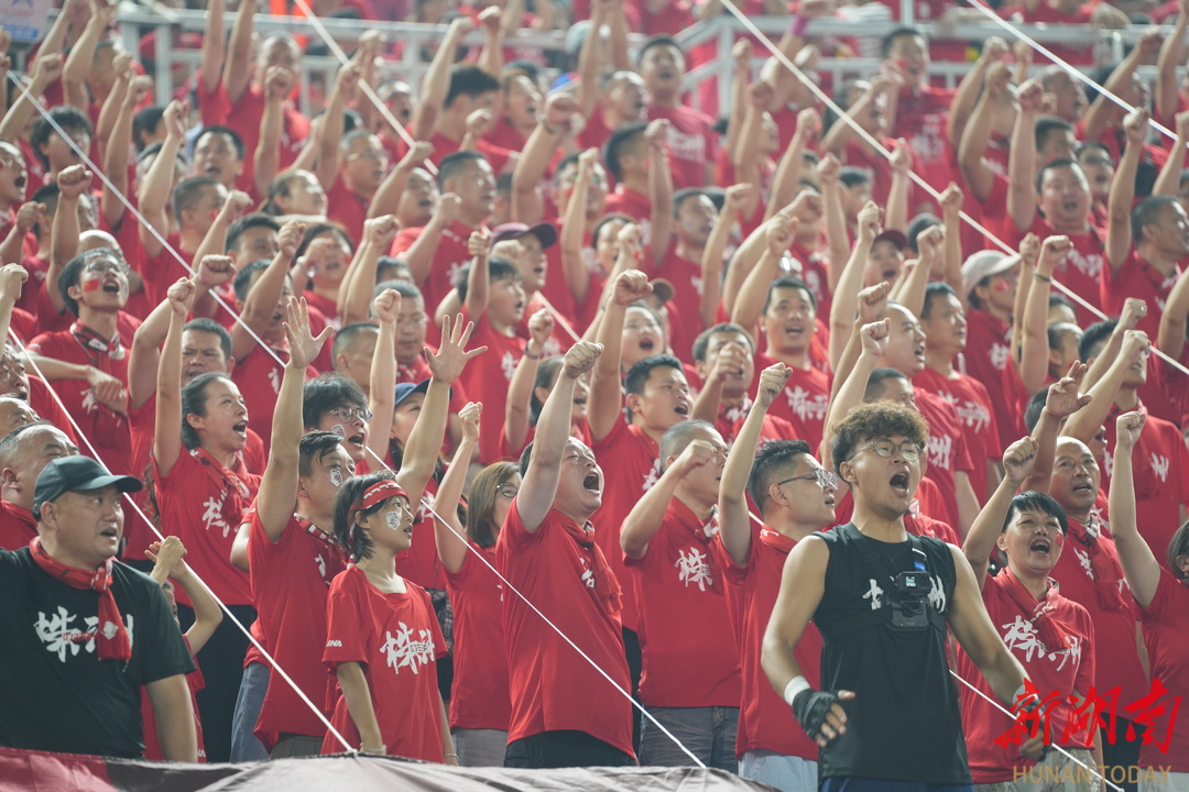 10月12日晚,株洲市体育中心体育场,球迷在加油助威。当天,2025湘超联赛进行第五轮比赛,株洲队(红)坐镇主场迎战怀化队。随着终场哨响,整场比赛结束,株洲队以3比0的比分战胜怀化队。 湖南日报全媒体记者 李健 摄