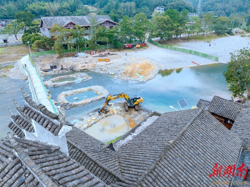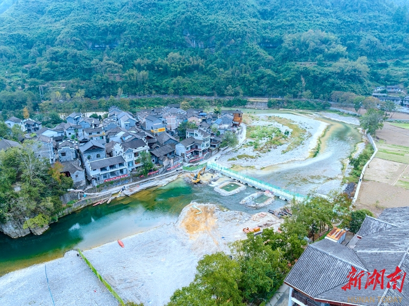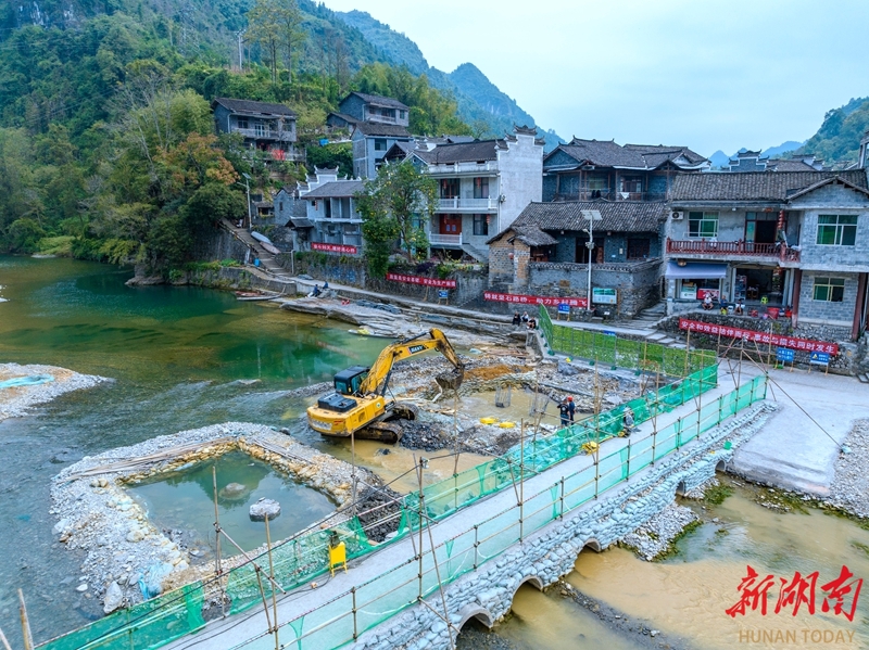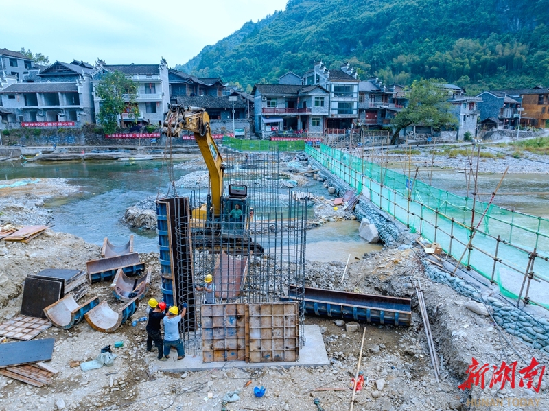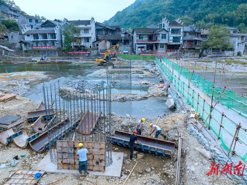 10月12日,吉首市矮寨镇坪朗村,工人在便民桥建设现场施工。坪朗村是全国传统村落及省级特色旅游名村,该桥建成后将切实解决村民出行难题,进一步助力乡村旅游发展。彭璟 摄(湖南图片库)