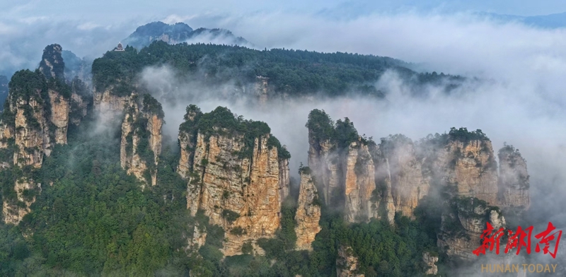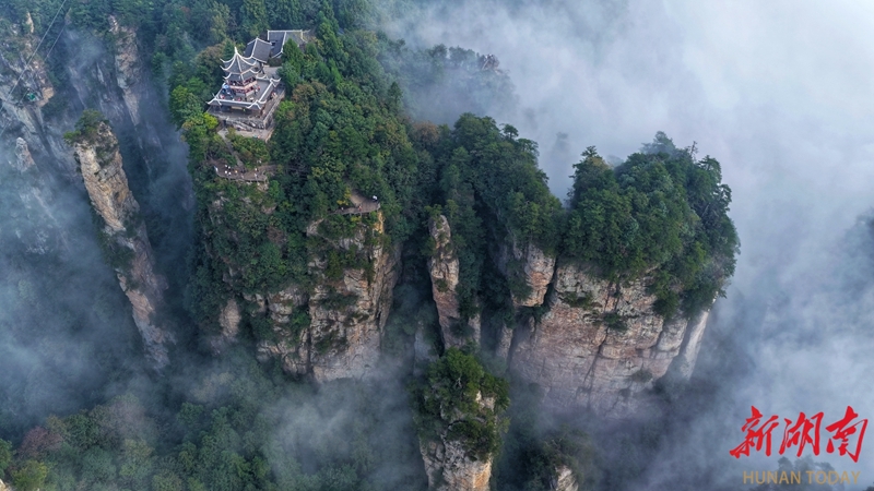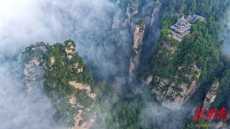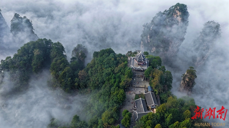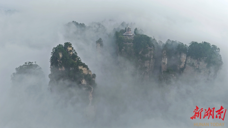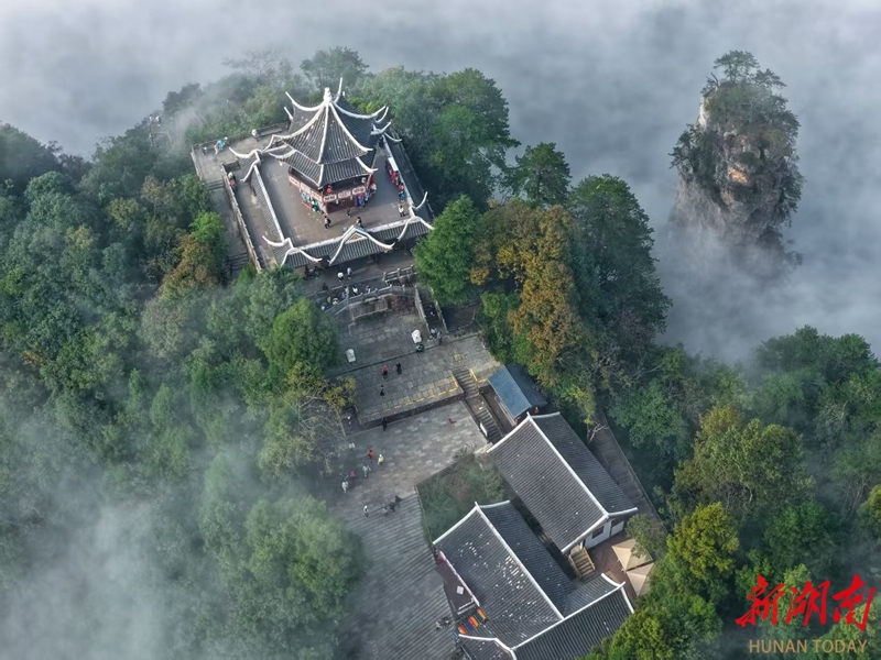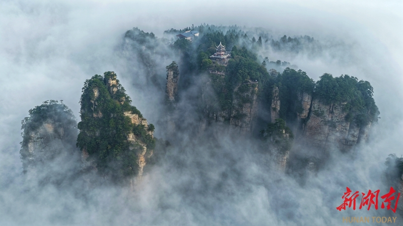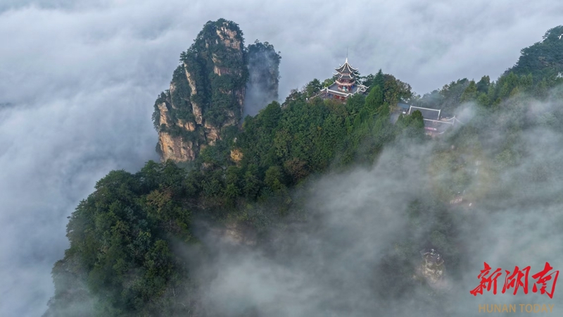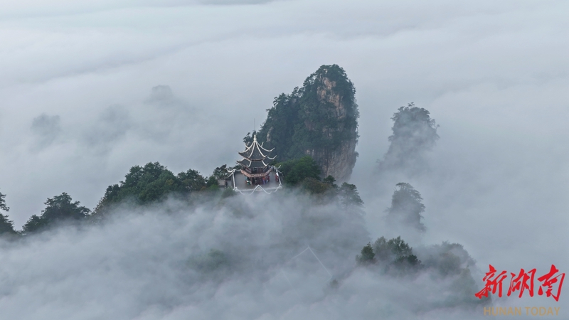 10月12日清晨,张家界国家森林公园黄石寨雨后云雾升腾,群峰隐没于茫茫云海之中,唯见黄石寨顶峰浮于云端,宛如“海市蜃楼”般奇幻壮观。这难得一见的自然奇景,引得中外游客纷纷驻足,争相记录下这宛若仙境的绝美瞬间。彭斌 摄(湖南图片库)