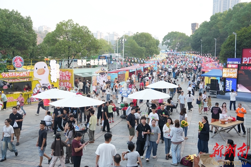 10月12日,株洲市体育中心体育场外,文旅集市热闹非凡。当晚,湘超联赛株洲队主场将对阵怀化队。在比赛期间,株洲市借赛事东风,推出相关文旅主题市集,带动文旅消费。 湖南日报全媒体记者 李健 摄