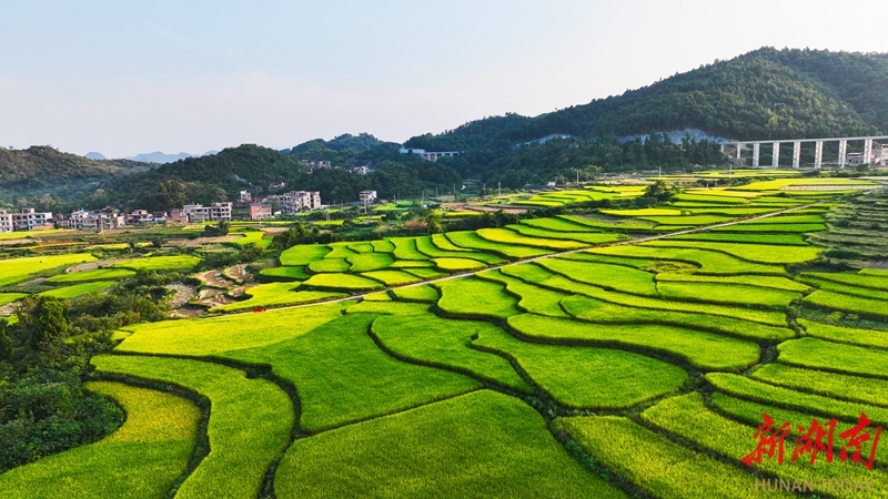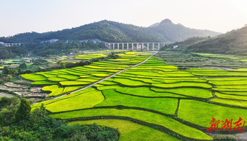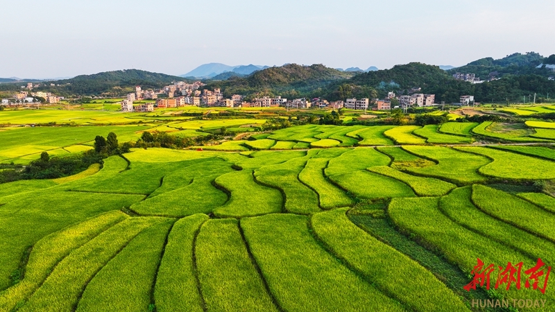 10月12日,新田县三井镇七贤山村梯田稻谷渐次成熟,层层叠叠的梯田与民居、青山相映成景,构成一幅秋日丰收画卷。刘贵雄 陈祉凝 摄影报道(湖南图片库)
