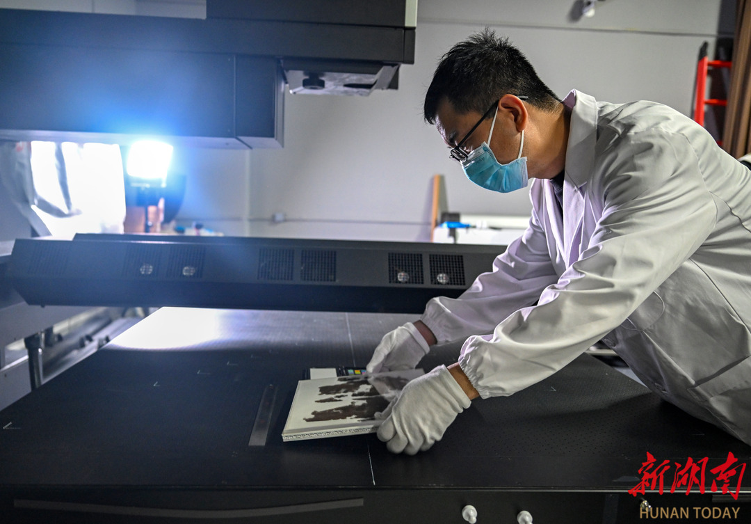 10月10日,湖南省博物馆文保中心,工作人员对长沙子弹库战国帛书残片进行红外透射图像采集。湖南日报全媒体记者 郭立亮 摄