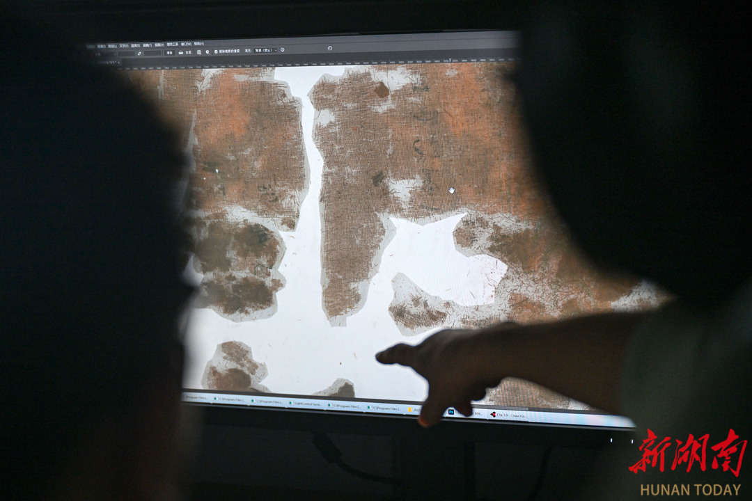 9月11日,湖南省博物馆文保中心,长沙子弹库帛书残片进行高清扫描后,工作人员在电脑上第一次清晰地看到帛书残片细节。湖南日报全媒体记者 郭立亮 摄