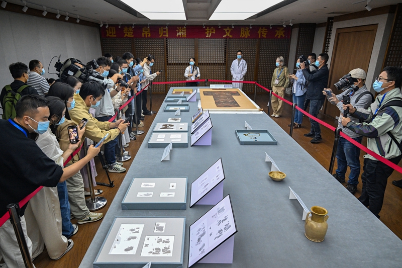 10月13日,长沙子弹库战国帛书第二、三卷划拨入藏仪式在湖南省博物馆举行,流失海外79载的国宝级文物重返其出土故地长沙。长沙子弹库战国帛书是迄今为止发现的中国最早的帛书和首个典籍意义上的古书。今年5月16日,美国正式将子弹库帛书移交中国国家文物局。5月18日,子弹库帛书的第二卷、第三卷结束79载漂泊回到祖国怀抱。9月10日,装着帛书的4个文物包装箱运抵湖南省博物馆。湖南日报全媒体记者 郭立亮 摄