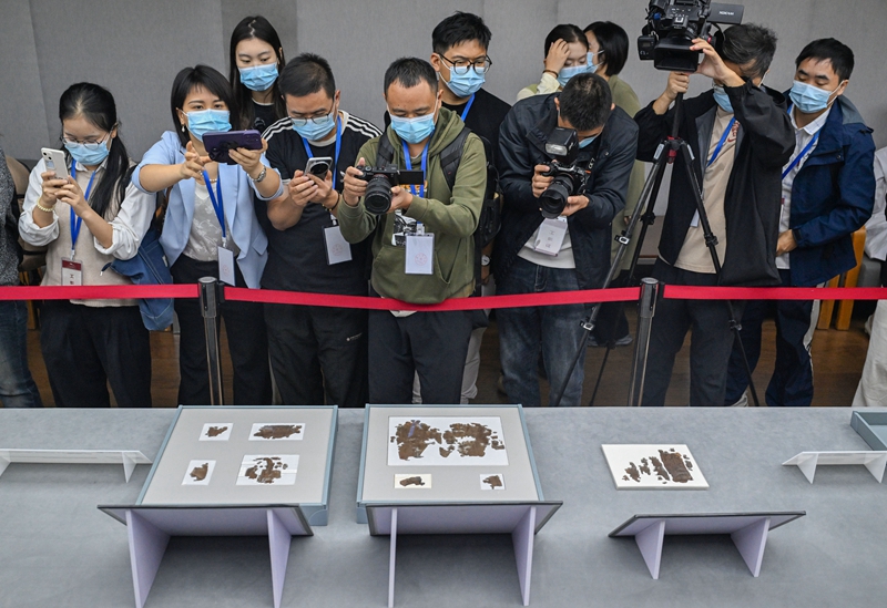 10月13日,湖南省博物馆文物观摩室,媒体记者在拍摄长沙子弹库战国帛书和其他馆藏文物。湖南日报全媒体记者 郭立亮 摄