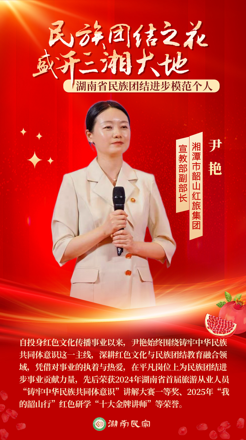 尹艳,韶山红旅集团宣教部副部长、现场教学老师。她投身红色文化传播事业,以党的民族政策为指引,深耕红色文化与民族团结教育融合领域。获2021年韶山市“优秀民兵”、2022年韶山市“最美拥军人物”、2024年湖南省首届旅游从业人员“铸牢中华民族共同体意识”讲解大赛一等奖、2025年“我的韶山行”红色研学“十大金牌讲师”等荣誉。2025年9月,中共湖南省委、湖南省人民政府授予尹艳“湖南省民族团结进步模范个人”称号。