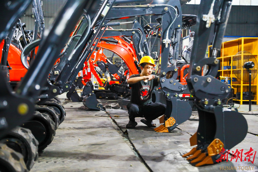 10月13日,新田县德力重工有限公司生产车间,工人在赶制微型挖掘机海外订单产品。近年来,该企业加大科技创新和产品研发力度,生产的各类园林挖掘机、电动挖掘机、油电两用挖掘机等微型挖掘机产品深受欧美、东南亚等海外市场青睐。刘贵雄 摄(湖南图片库)