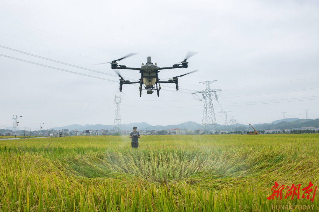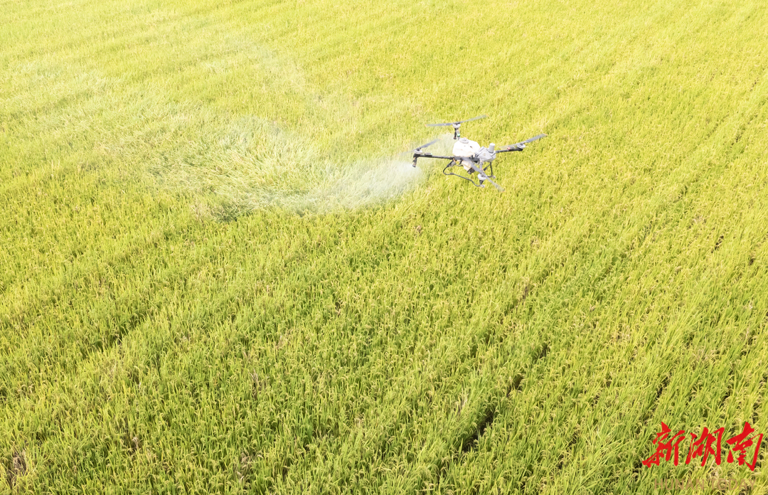 10月13日,涟源市杨市镇梅林村,植保无人机在水稻田进行飞防作业。晚稻成熟期,涟源市重点推广高效精准的植保无人机作业,实现节水节药,保障晚稻丰产丰收。吴永华 摄(湖南图片库)