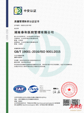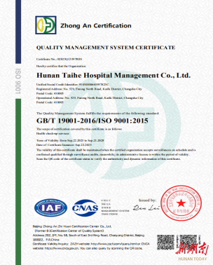 长沙泰和医院健康管理中心始终将质量视为发展根基。取得ISO 9001认证,意味着该中心在内部管理、实际工作及售后服务等方面建立起了一套完善的质量管理体系。这表明您在该院健康管理中心接受的每一项体检服务,都经过了国际通用标准的检验,品质有保障,放心更安心。