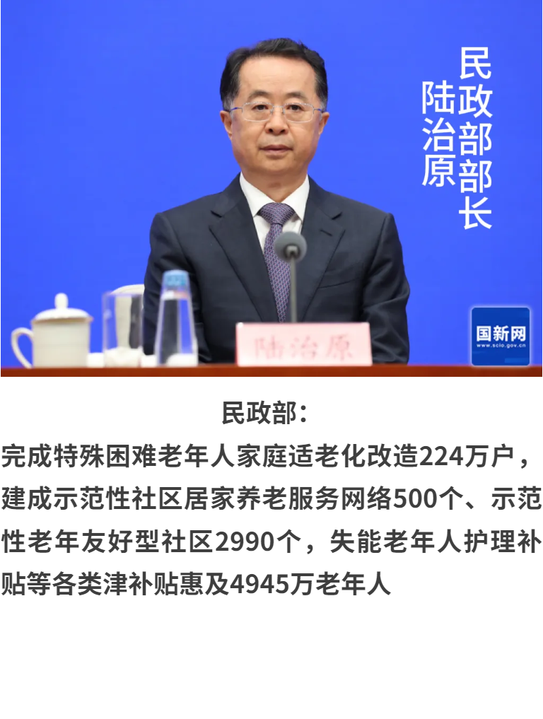 民政部部长陆治原表示:五年来,老龄工作和养老服务发展迈出新步伐。养老服务方面,截至2024年底,全国养老机构和设施达到40.6万个、床位799.3万,护理型床位占比从2020年的48%提高到65.7%。完成特殊困难老年人家庭适老化改造224万户,建成示范性社区居家养老服务网络500个、示范性老年友好型社区2990个、老年助餐点8.6万个,每天有300多万老年人在老年就餐点就餐。高龄津贴、经济困难老年人服务补贴、失能老年人护理补贴等各类津补贴惠及4945万老年人,进一步增进了老年人福祉。