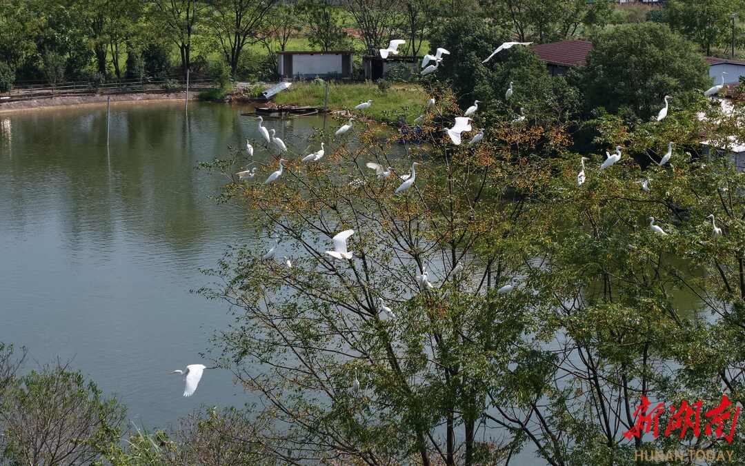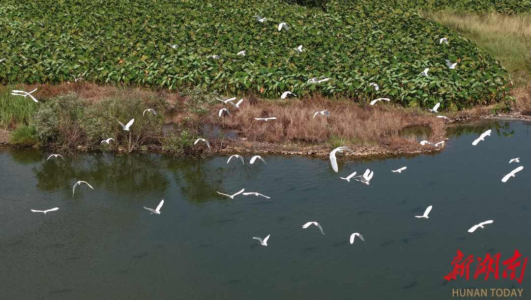 10月12日,蓝山县塔峰镇岭脚村,一群白鹭在池塘边展翅飞翔。深秋时节,大量候鸟途经蓝山飞往南方过冬。近年来,该县政协委员中共和科技界联组加大候鸟保护科普知识宣传力度,增强干部群众爱鸟护鸟意识,野生鸟类生存环境持续优化,保护“千年鸟道”安全。(湖南日报·新湖南客户端通讯员 厉惺 杨雄春 摄影报道)