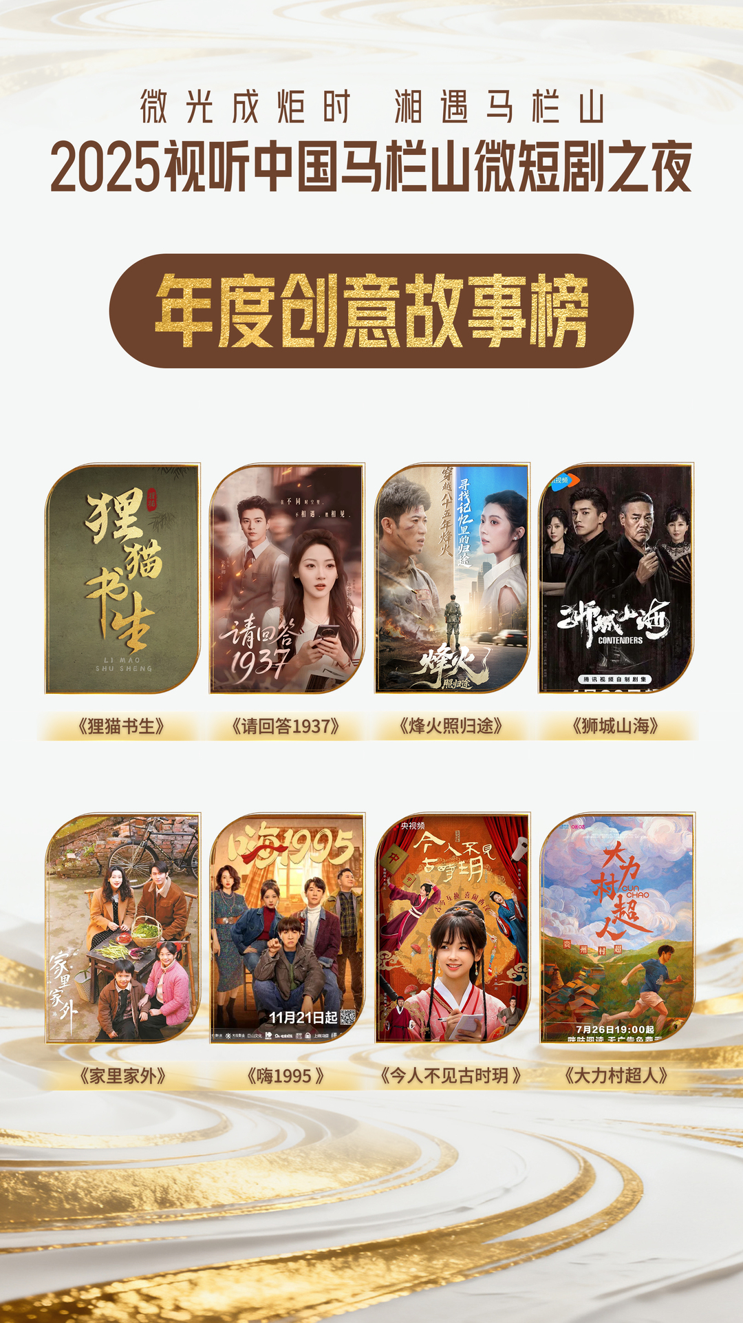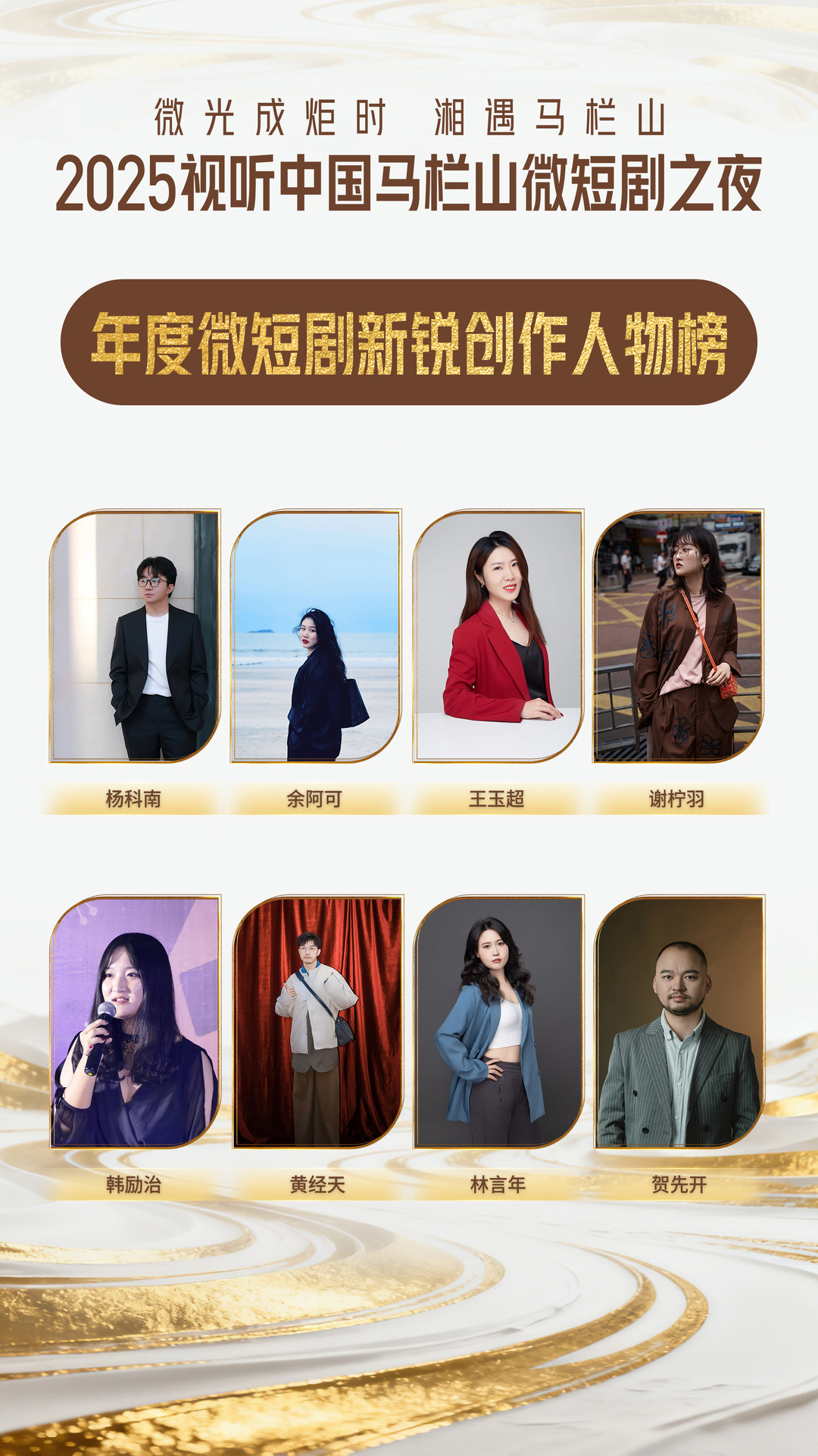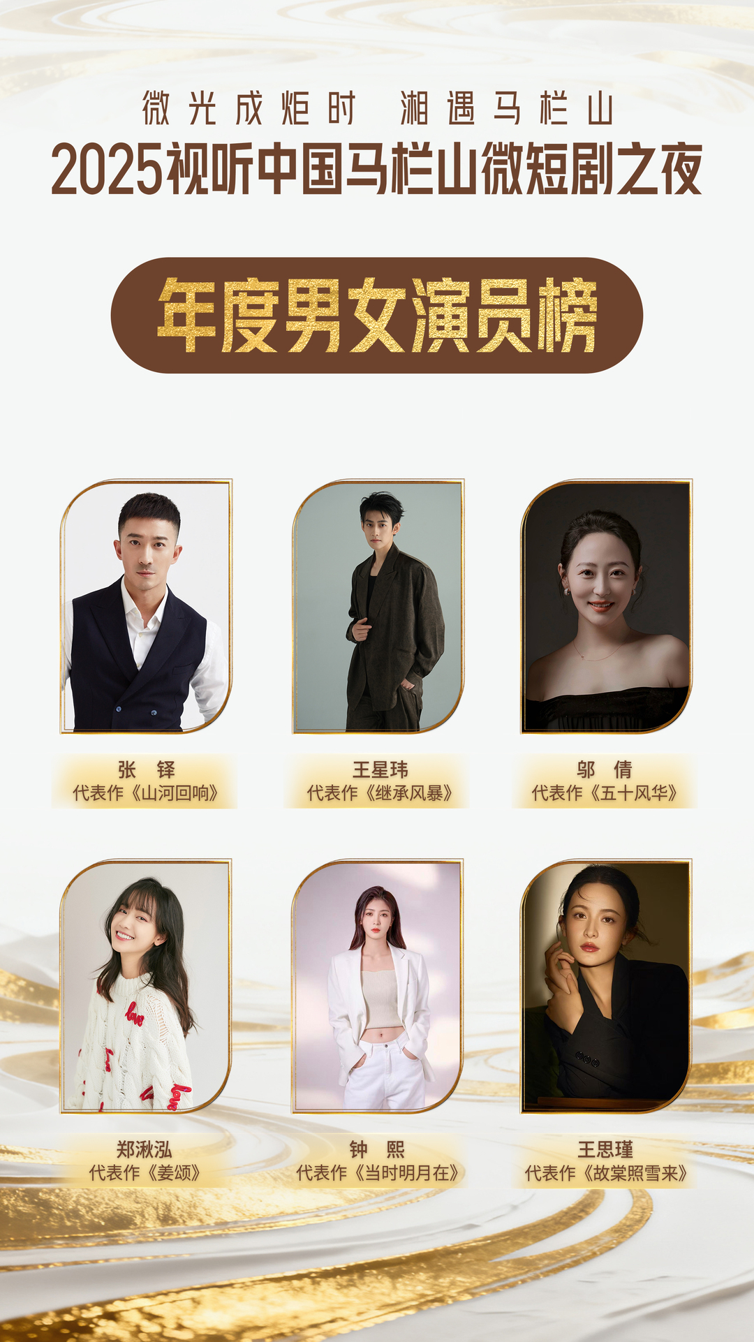 湖南日报·新湖南客户端10月14日讯(记者 邓正可)10月14日,“2025视听中国马栏山微短剧之夜”在长沙举行,全国网络视听从业者、行业知名专家学者与一线创作者等,聚焦微短剧创新成果与前沿趋势进行深度交流分享。当晚,年度男女演员榜、年度创意故事榜、年度赋能价值榜、年度视觉呈现榜、年度科技先锋榜、年度微短剧新锐创作人物榜六大榜单揭晓。其中,演员张铎、王星玮、邬倩、郑湫泓、钟熙、王思瑾登上年度男女演员榜。