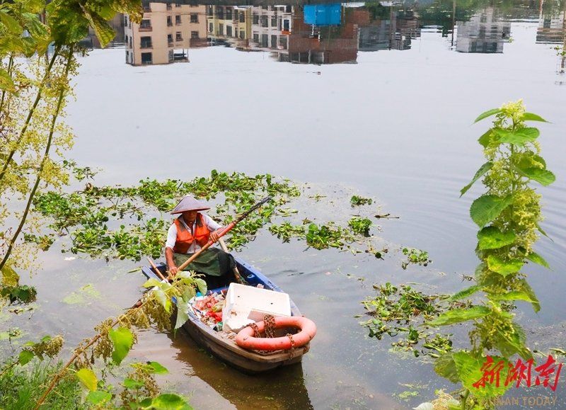 10月14日,新田县舂陵河双碧广场段,河道保洁员在打捞河面上的水葫芦和杂物。近年来,该县全面推行河湖长制,不断加强河湖生态治理保护,落实河道保洁队伍和长效管护机制,全力保护水环境、改善水生态,打造“水清、岸绿、河畅、景美”的生态环境。刘贵雄 陈祉凝 摄(湖南图片库)