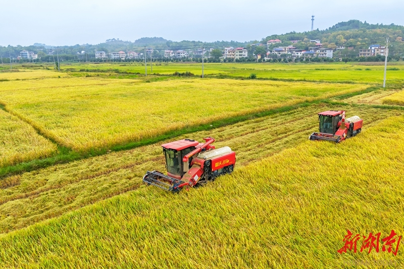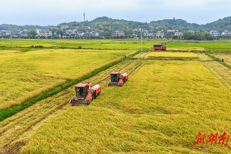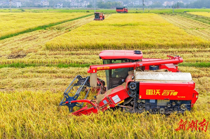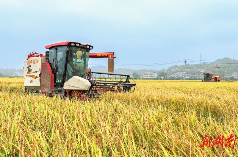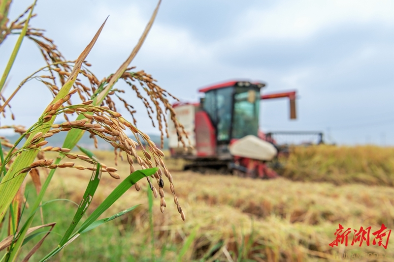 10月14日,东安县鹿马桥镇石坝冲村,收割机在抢收晚稻。金秋时节,当地高标准农田水稻种植示范基地的晚稻陆续成熟,农民利用晴好天气抢收晚稻,田间地头呈现一派忙碌的丰收景象。蔡小平 邓夏霖 摄影报道(湖南图片库)