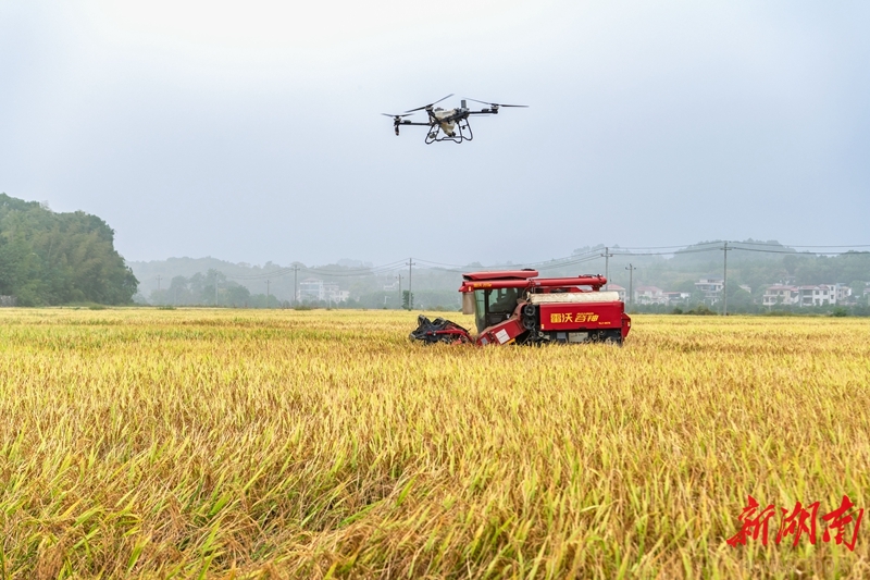 10月14日,东安县鹿马桥镇石坝冲村,植保无人机正在进行除露水作业,为收割机收割晚稻提供技术支持。金秋时节,当地高标准农田水稻种植示范基地的晚稻陆续成熟,农民利用晴好天气抢收晚稻,田间地头呈现一派忙碌的丰收景象。蔡小平 邓夏霖 摄影报道(湖南图片库)