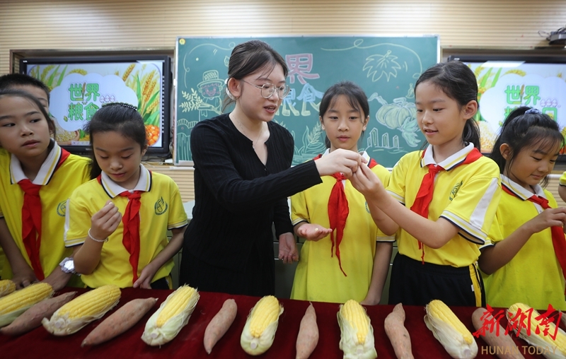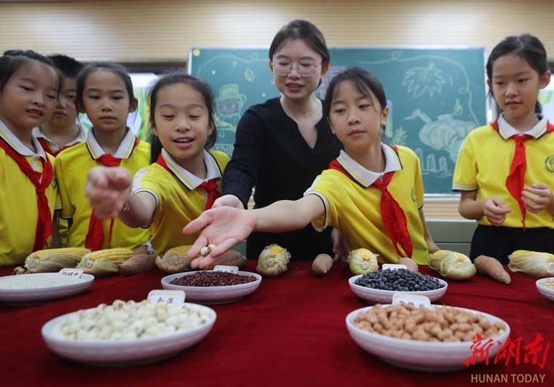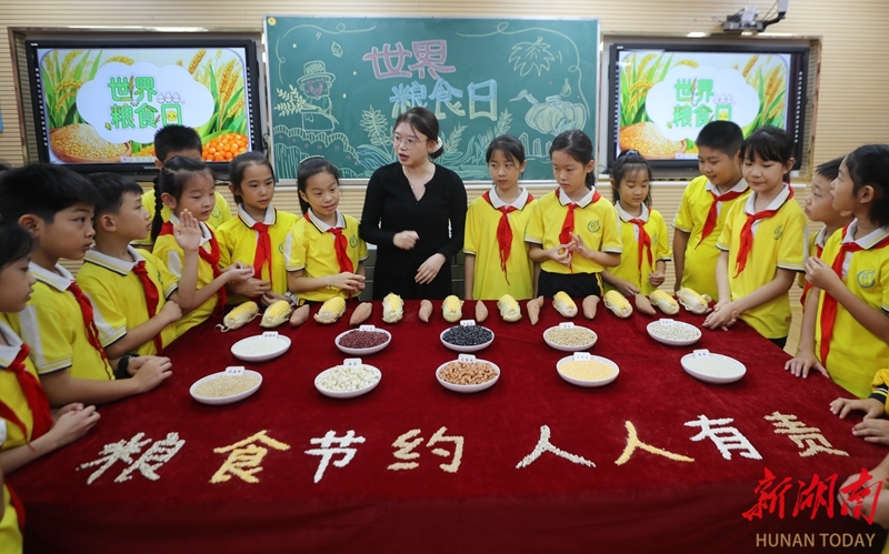 10月14日,在世界粮食日来临之际,衡阳市雁峰区环城南路小学开展“粮食节约,人人有责”主题班会活动。学生们通过辨识五谷杂粮、了解粮食营养成分、参与实物展示等方式,学习粮食知识,树立节约意识,培养爱惜粮食的良好习惯。曹正平 旷丹 摄影报道(湖南图片库)