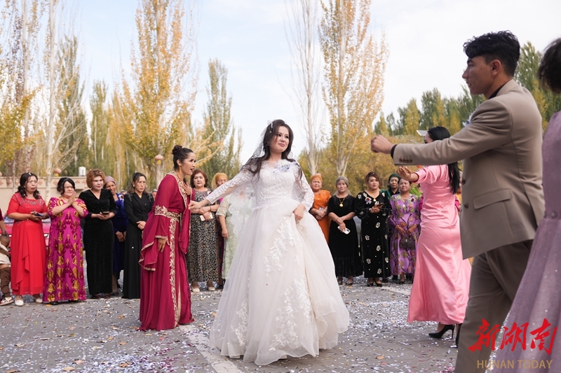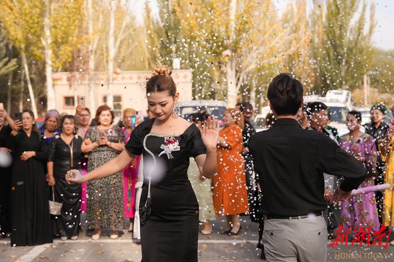 10月14日,新疆维吾尔自治区吐鲁番市鄯善县连木沁镇阿斯坦村,一对新婚夫妇与亲朋好友载歌载舞,共同庆祝幸福时刻。近年来,湖南省第十批援疆工作队分批投入650万元援疆资金,启动阿斯坦村基础设施提质与民生改善工程建设。目前,援疆桥、河畔美食广场、露营基地和休闲步道四项工程已全部建成,持续巩固人居环境整治成果,推进宜居宜业和美乡村建设,稳稳托起村民的幸福生活。湖南日报全媒体记者 辜鹏博 摄