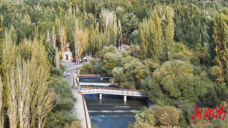 10月14日,新疆维吾尔自治区吐鲁番市鄯善县连木沁镇阿斯坦村,援疆桥、休闲步道与二塘河构成一幅美丽秋色画卷。近年来,湖南省第十批援疆工作队分批投入650万元援疆资金,启动阿斯坦村基础设施提质与民生改善工程建设。目前,援疆桥、河畔美食广场、露营基地和休闲步道四项工程已全部建成,持续巩固人居环境整治成果,推进宜居宜业和美乡村建设,稳稳托起村民的幸福生活。湖南日报全媒体记者 辜鹏博 摄
