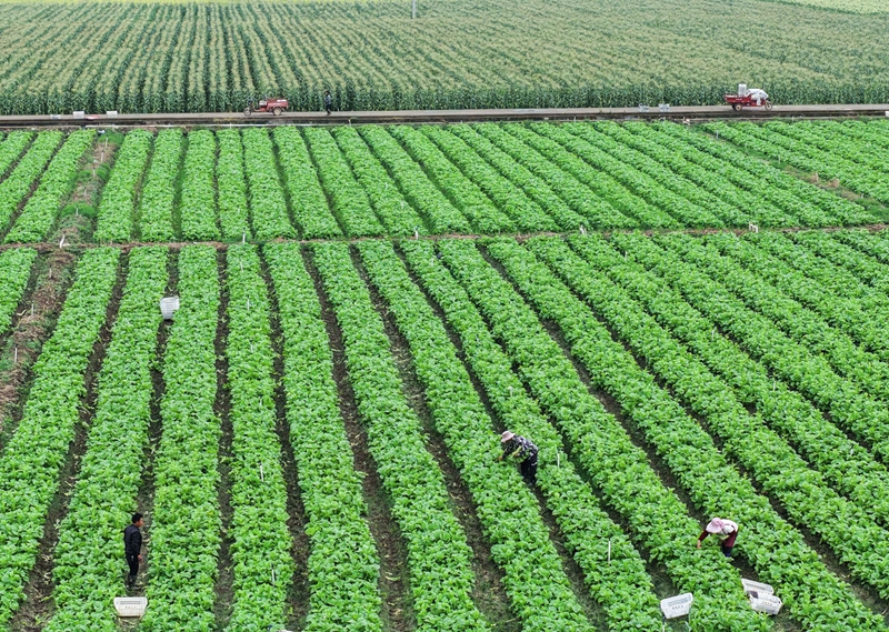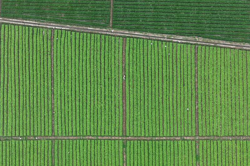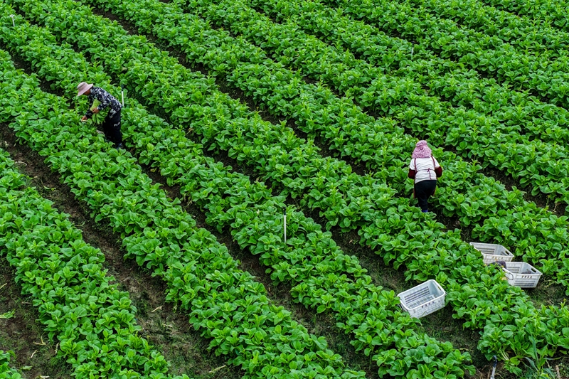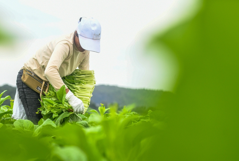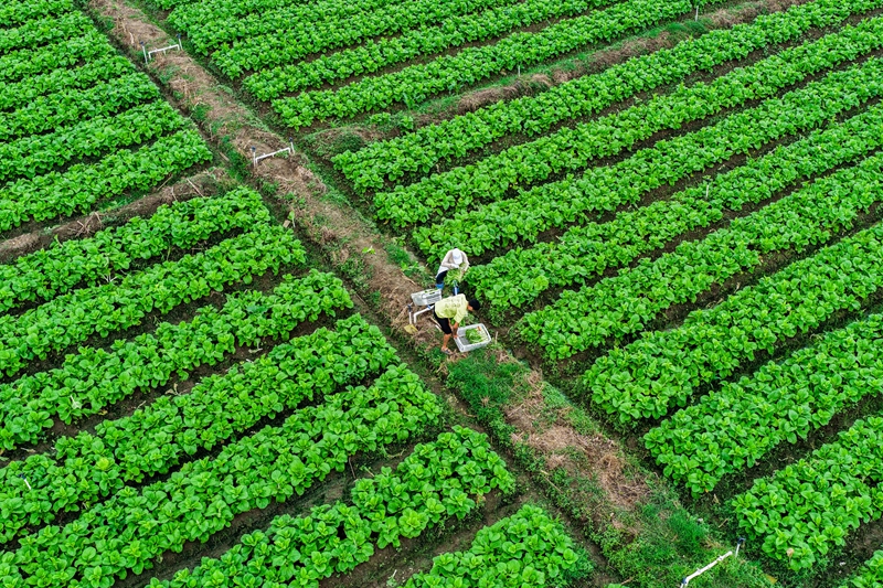 10月14日,道县原地正禾农场蔬菜基地,农民在采收蔬菜。时下,该基地种植的头茬秋冬播蔬菜迎来收获期,农民抢抓农时加紧采摘,供应粤港澳大湾区市场。蒋克青 摄(湖南图片库)