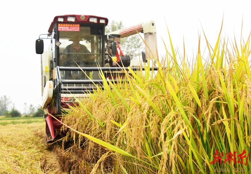 10月14日,澧县大堰垱镇星星村,农机手驾驶农机收割晚稻。时下,澧县迎来晚稻收获高峰,当地组织农机参与抢收,确保丰产丰收。柏依朴 胡锐 摄影报道(湖南图片库)