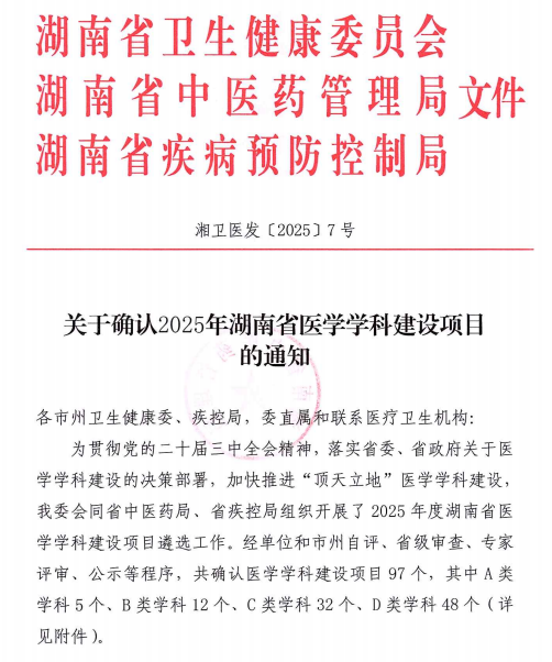 大众卫生报·新湖南客户端10月15日讯(通讯员 许敏)近日,湖南省卫生健康委正式公布2025年省级临床重点专科评审及2025年湖南省医学学科建设项目评审结果,衡阳市中心医院斩获佳绩,9个专科成功入选,标志医院专科建设水平与综合能力获上级部门及省内专家高度认可,相关专科已稳步跻身省内专科第一方阵。