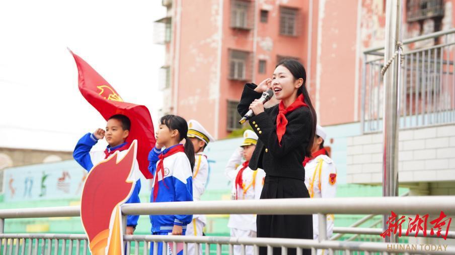 仪式伊始,激昂的《出旗曲》划破校园长空。三名少先队旗手昂首挺胸,手擎鲜红队旗,迈着铿锵有力的步伐穿过操场。全体少先队员与辅导员整齐肃立,右手高举过头顶行队礼。随后,《我们是共产主义接班人》的旋律响起,全场师生放声歌唱,为“十·一三”建队纪念日注入鲜活的少年力量。