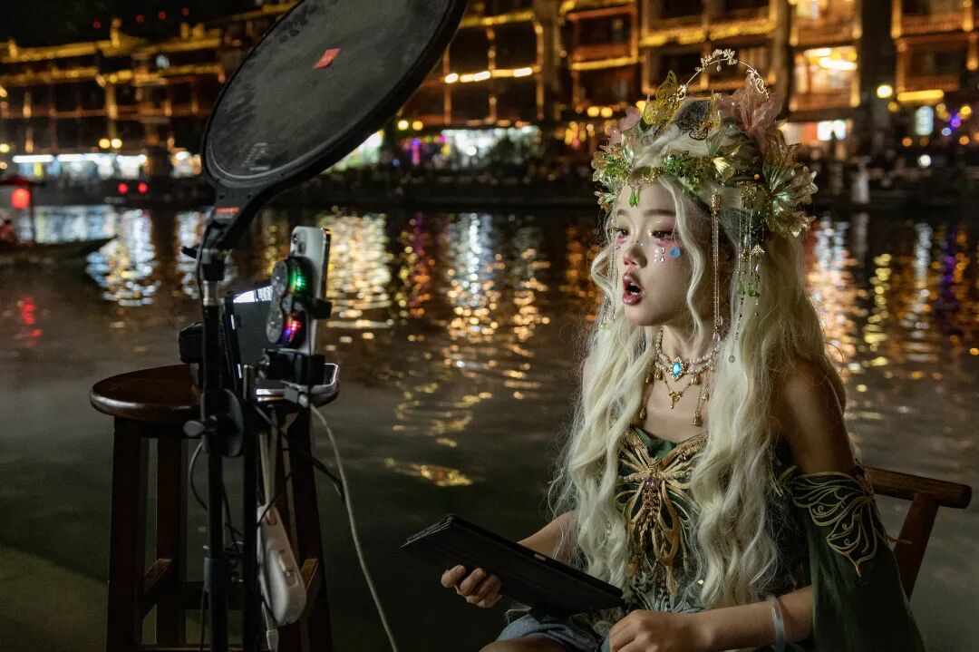 然而近日再访,镜头里的景致已悄然更迭:吊脚楼的飞檐下,土家姑娘支起了手机支架,银饰叮当与“宝宝们看过来”的吆喝声交织;网红民宿的霓虹招牌与红灯笼在古街争辉;无人机在沱江上空盘旋,将“小桥流水”的热闹注入直播画面。