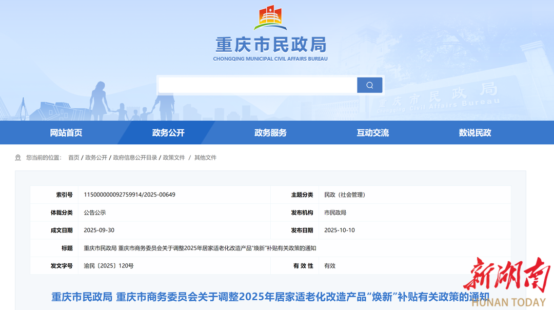 重庆市民政局 重庆市商务委员会关于调整2025年居家适老化改造产品“焕新”补贴有关政策的通知