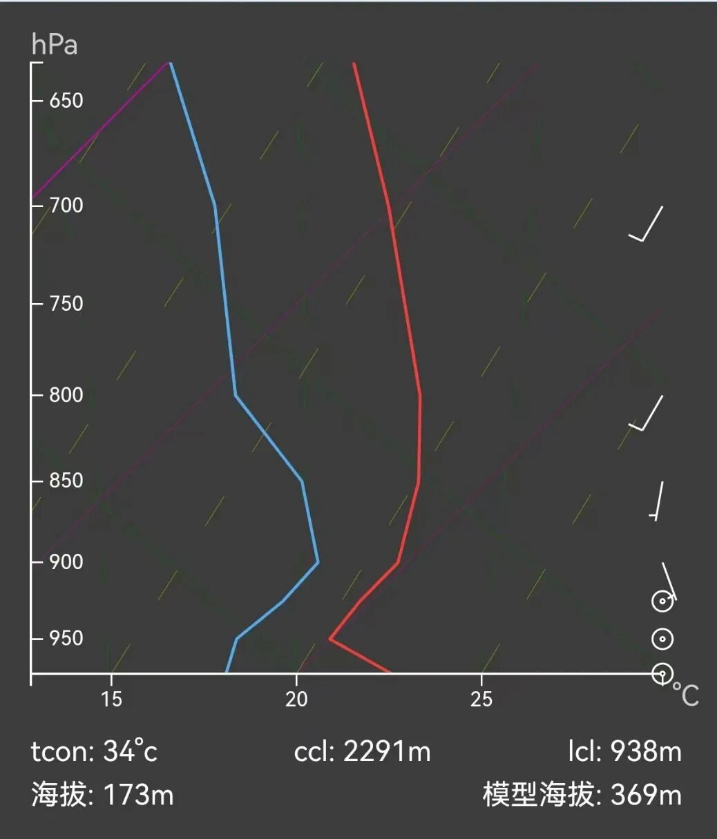 探空曲线图表明目前城区600-900米高空存在逆温层,污染物不易扩散