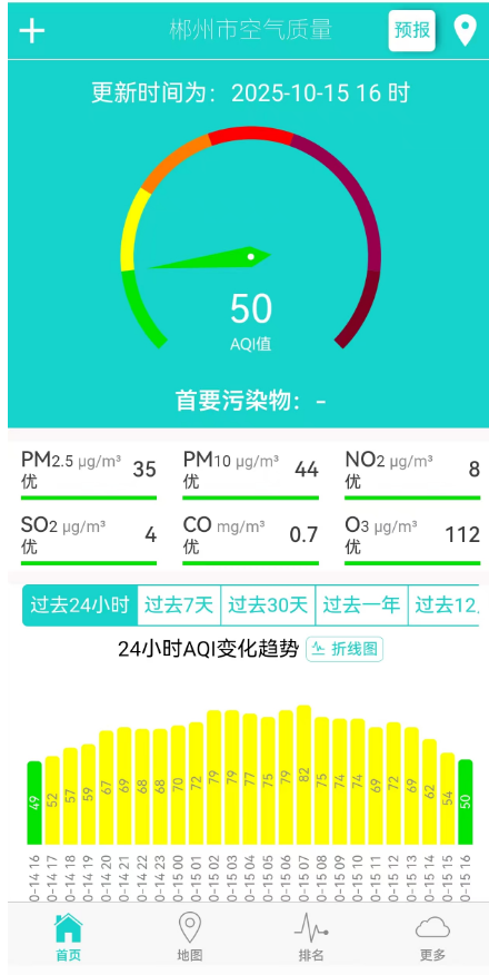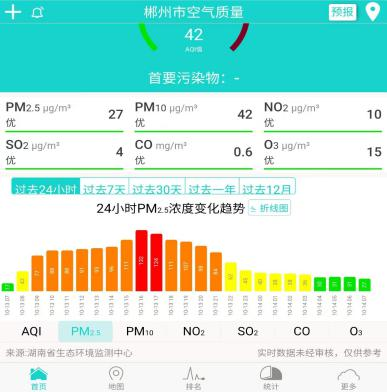 先看当前情况 —— 城区整体被轻雾笼罩,部分地方能见度不足2公里,远处的高楼好像 “蒙了层纱”。从数据上看,10月14日到10月15日郴州市空气质量等级为良,PM2.5最高小时浓度60微克/立方米,截止10月15日16时,郴州市PM2.5 浓度为 35微克/立方米,空气质量等级为优,但因为城区大雾,导致大气能见度差。