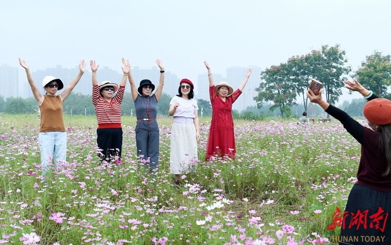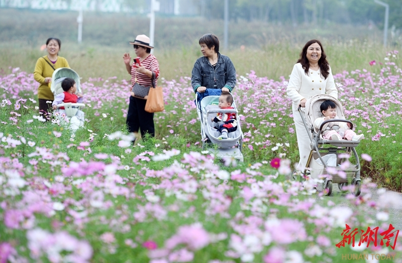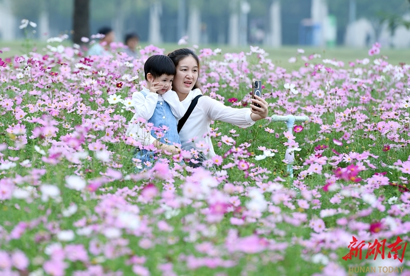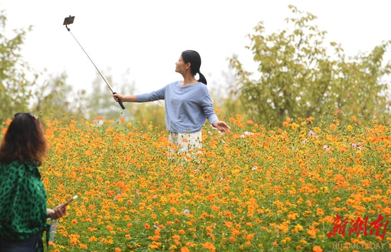 10月15日,长沙洋湖国家湿地公园,成片的硫华菊、波斯菊竞相开放,各色的花朵迎风摇曳,汇成一片色彩斑斓的海洋,吸引不少游客慕名前来赏花游园、拍照打卡。湖南日报全媒体记者田超 摄