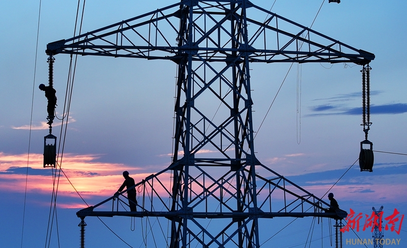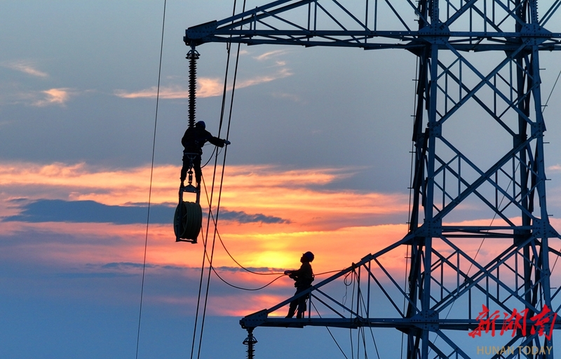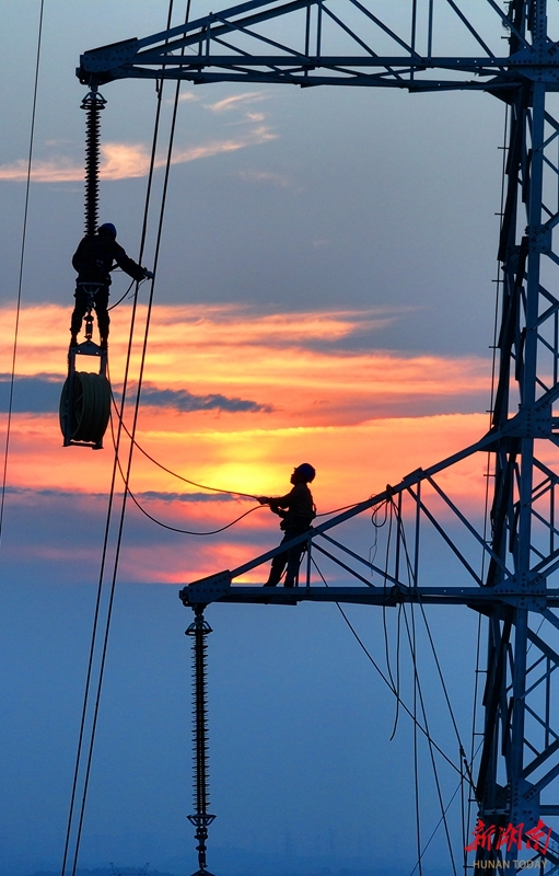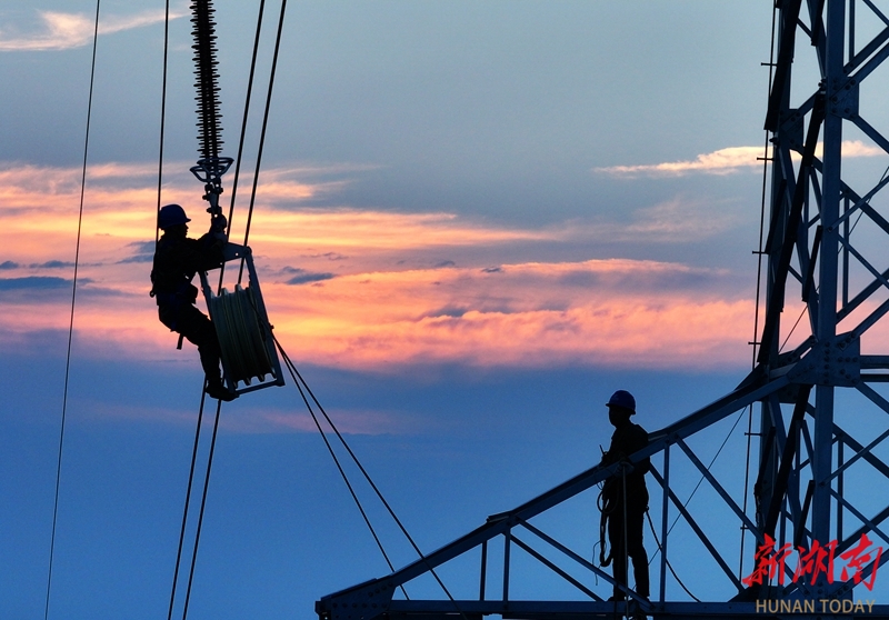 10月15日,衡阳市蒸湘区雨母山镇,施工人员在进行高塔架线作业。“宁电入湘”工程全面投产后,为充分利用好资源,保障用电可靠性,国网衡阳供电公司加紧实施辖区内电网加强和改造工程。施工人员抢抓工期,全力开展高塔线路架线工作,确保项目按期高质量完成,为地区经济发展提供可靠电力保障。曹正平 彭国平 摄影报道(湖南图片库)