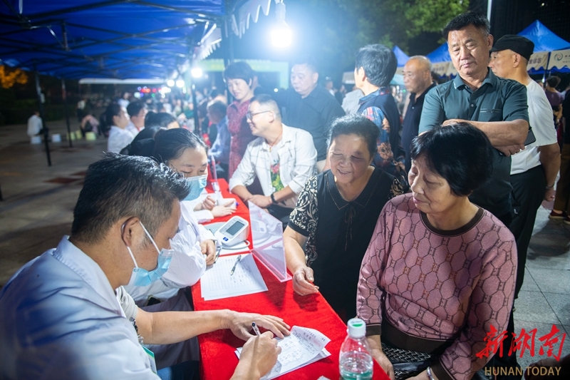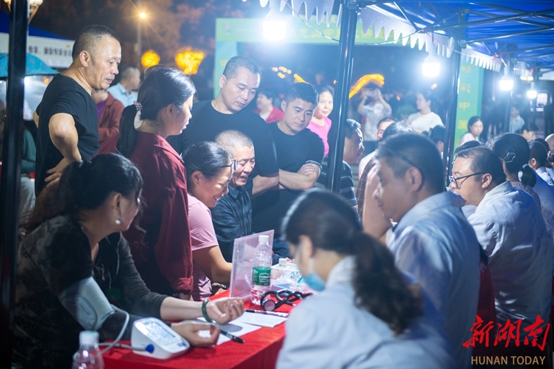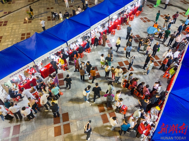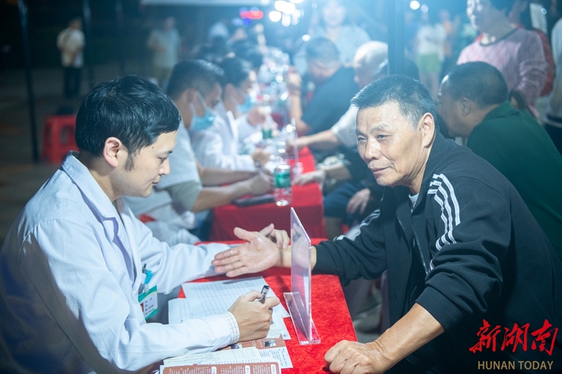 10月15日晚,娄底市娄星区娄星广场,娄底市中医医院医务人员为市民把脉、诊疗。当晚,当地举办中医药健康夜市活动,现场提供中医义诊、特色疗法体验和药膳茶饮等服务,让中医药文化融入群众生活,吸引众多市民参与。吴永华 张海波 摄影报道(湖南图片库)