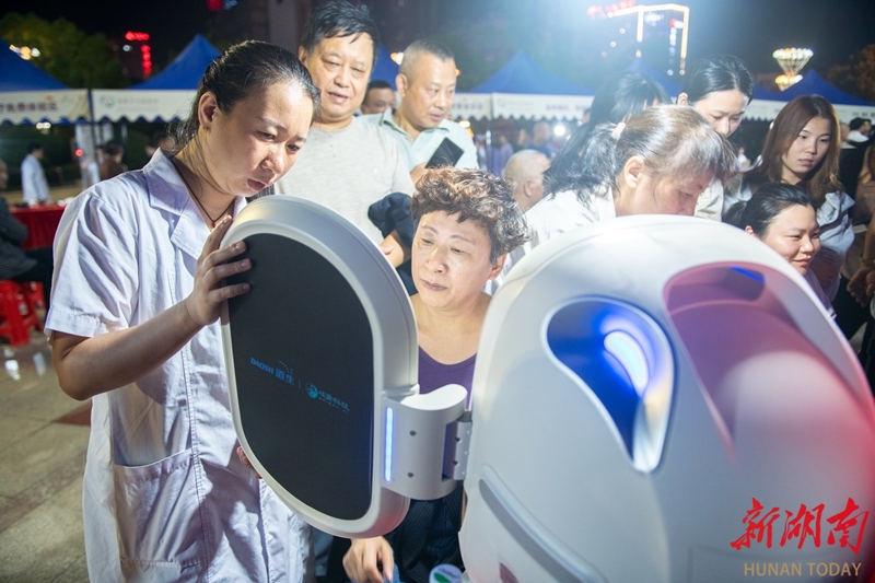 10月15日晚,娄底市娄星区娄星广场,市民体验体质辨识仪。当晚,当地举办中医药健康夜市活动,现场提供中医义诊、特色疗法体验和药膳茶饮等服务,让中医药文化融入群众生活,吸引众多市民参与。吴永华 张海波 摄影报道(湖南图片库)