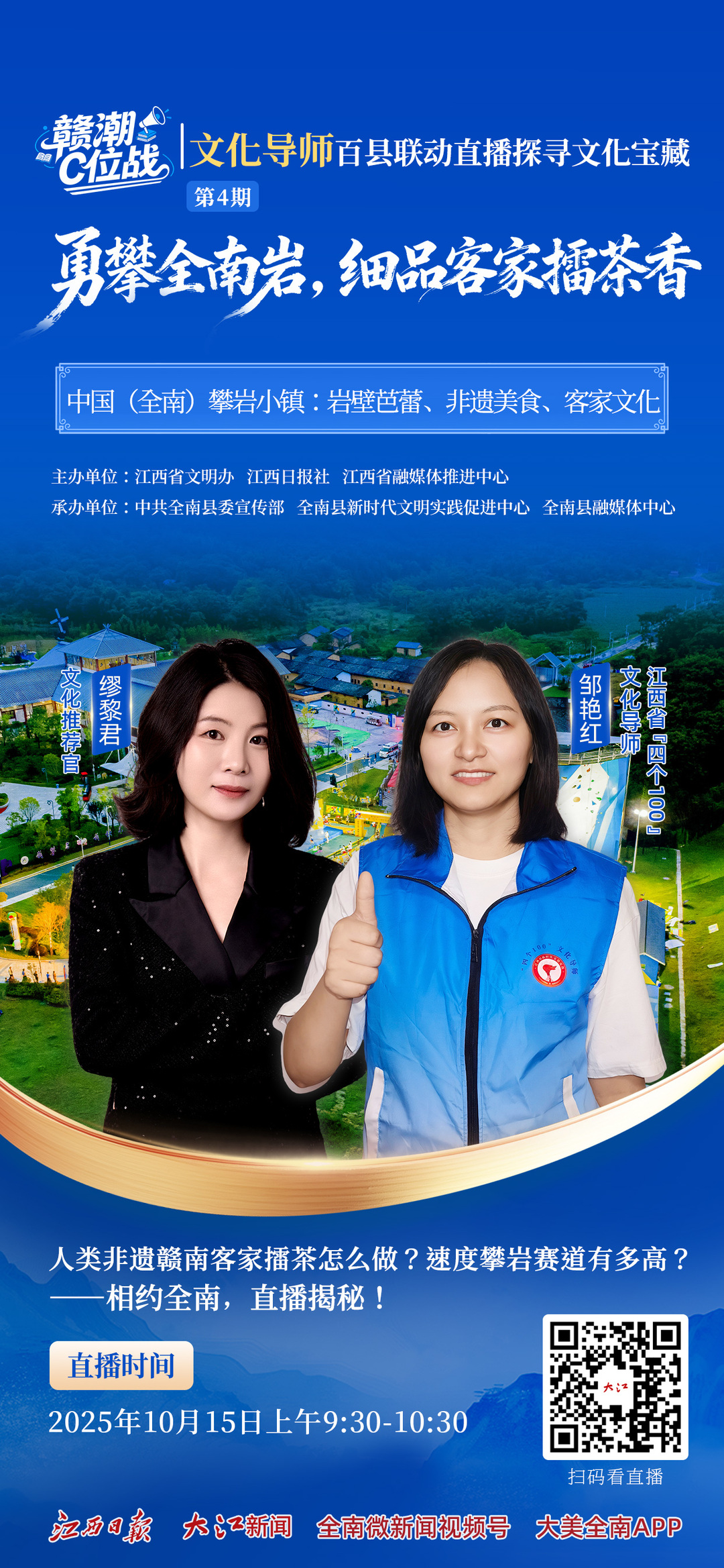 10月15日9:30—10:30,“赣潮C位战”丨文化导师百县联动直播活动第四站将走进这座赣粤边际的魅力小城。江西省“四个100”文化导师将化身“文化探宝人”,实地体验“岩壁芭蕾”的刺激,见证一碗正宗赣南客家擂茶从选料到研磨的制作全过程,并观看瑶族花棍舞,感受少数民族特色风情,邀请广大网友共同沉浸式体验全南独特的文化魅力与运动活力。