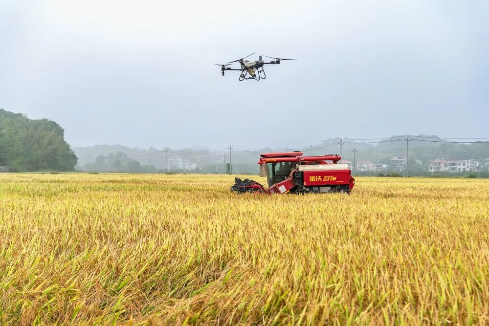 10月14日,东安县鹿马桥镇石坝冲村,植保无人机低空作业去除稻穗露水,为高标准农田晚稻收割提供技术护航。蔡小平 邓夏霖 摄