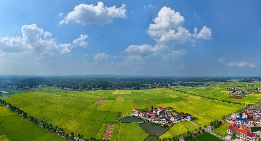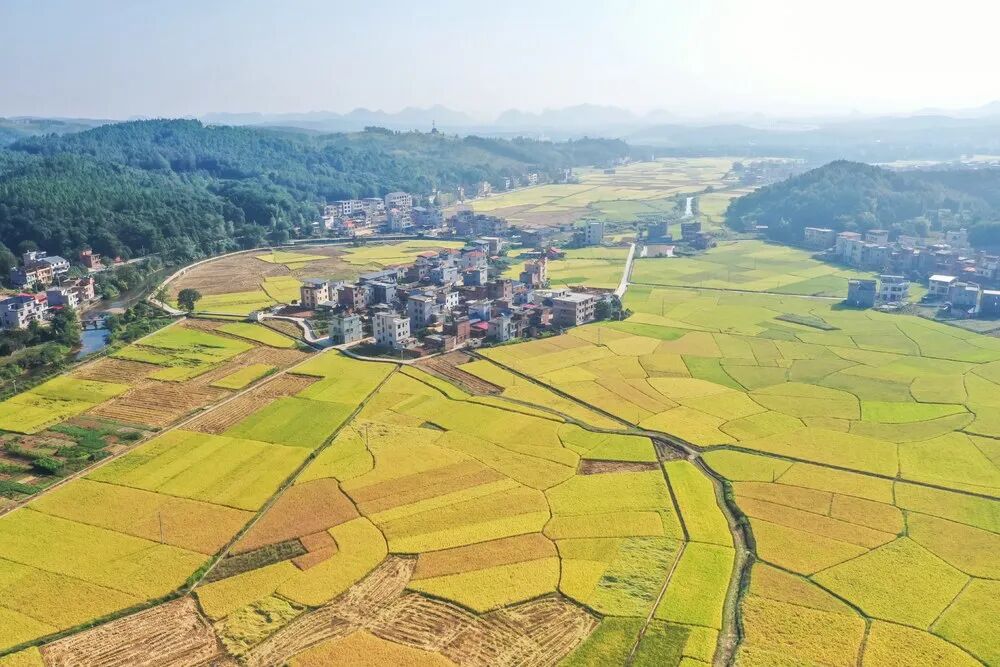 10月12日,蓝山县土市镇团结村,金黄稻田与青山、民居相映成趣,勾勒出秋日乡村“丰”景如画的诗意画卷。彭华 摄