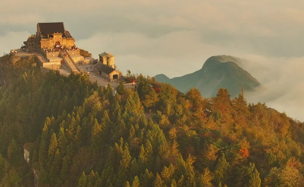 阳光穿透云海洒向山间,红叶与云海交相辉映,构成“上有云海浩渺,下有红叶似火”的立体秋景。