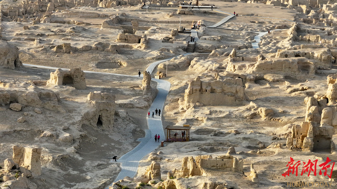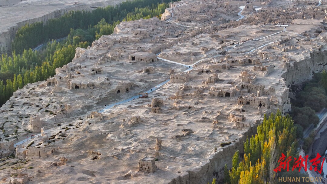 10月15日,俯瞰交河故城。交河故城位于东天山南麓、吐鲁番盆地北缘的绿洲地带,是世界上保存最完整、延续时间最长、规模最大的生土结构古代建筑城市。交河故城曾是古丝绸之路的重要城镇,1961年入选第一批全国重点文物保护单位,2014年作为“丝绸之路:长安—天山廊道的路网”的组成部分列入《世界遗产名录》。湖南日报全媒体记者 辜鹏博 摄