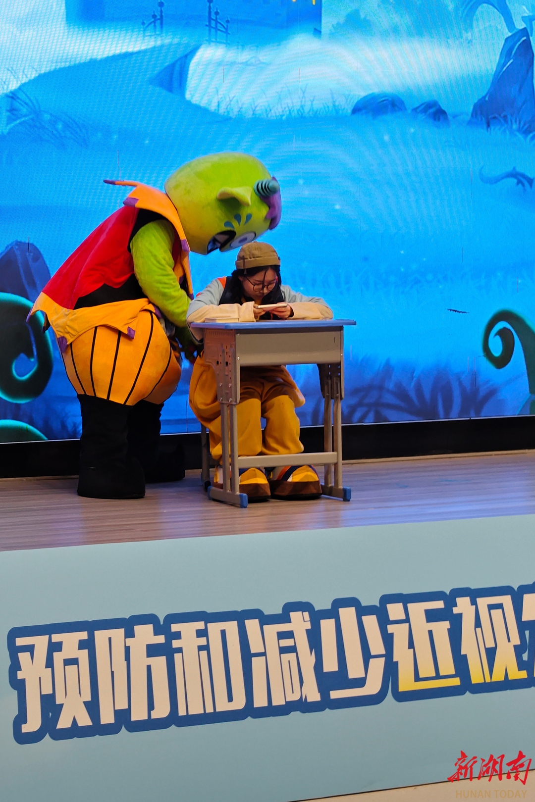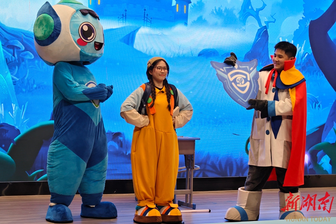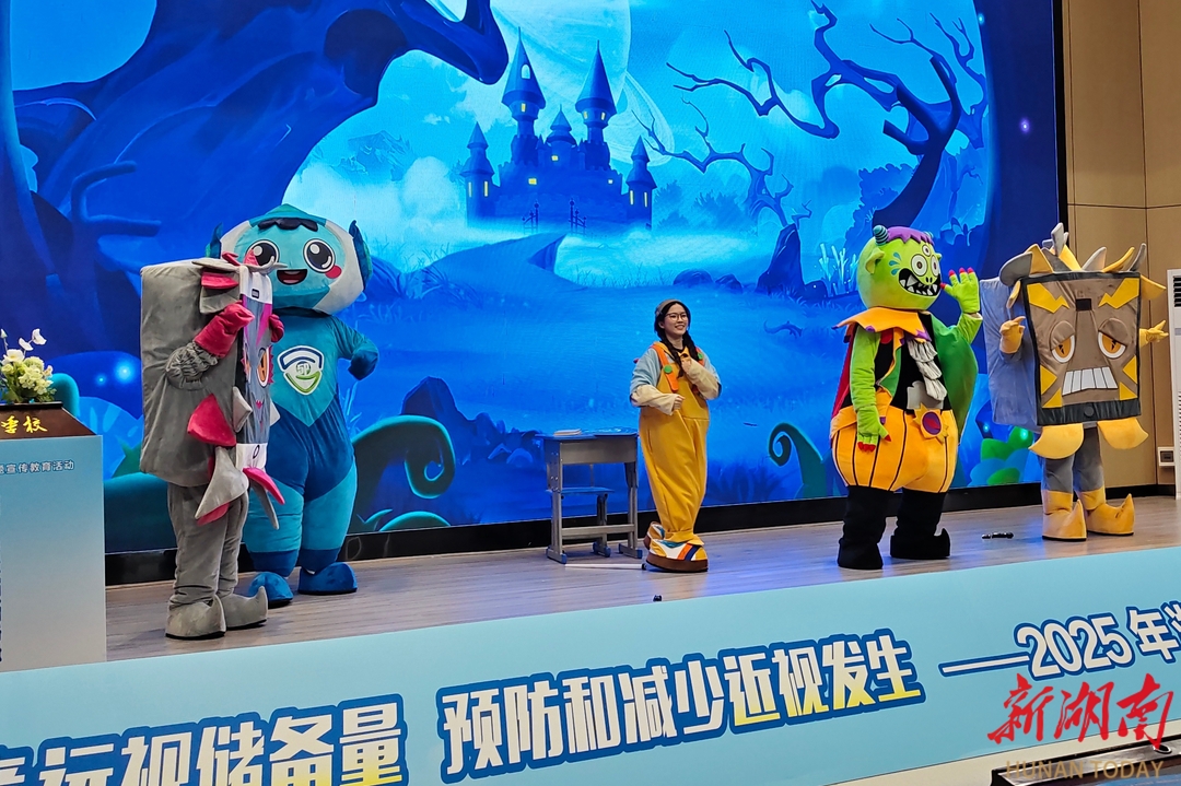 10月17日,湘西州近视防控主题宣传教育活动在吉首市芙蓉学校举行。活动现场,湘西州爱尔眼科医院的医护人员为孩子们献上了5P近视防控科普大型儿童舞台剧《瞳梦国奇旅》。该剧巧妙融入近视防控知识,并精心设计了互动环节,通过寓教于乐的表演形式,让孩子们在欢声笑语中学习爱眼护眼知识。彭彪 摄(湖南图片库)