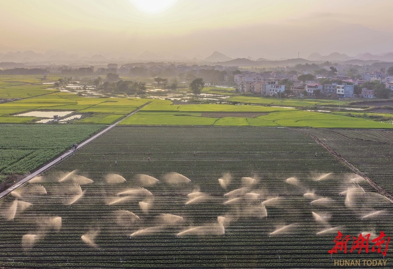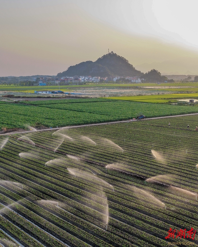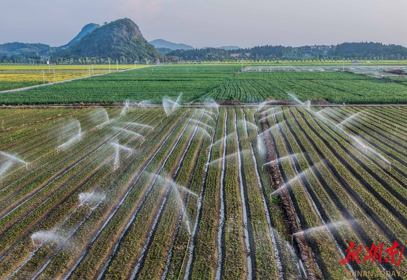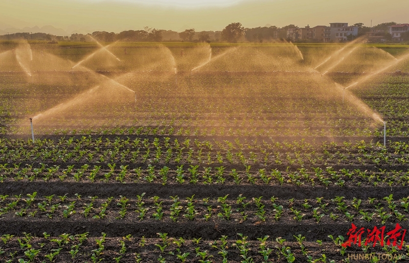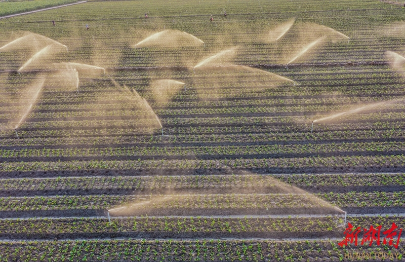 10月17日,道县清塘镇原地正禾农场蔬菜种植基地,自动喷灌系统在进行喷淋作业。近年来,该县通过推广滴灌、喷灌等高效节水技术,提升水资源利用效率,有效促进农业增收。蒋克青 摄(湖南图片库)