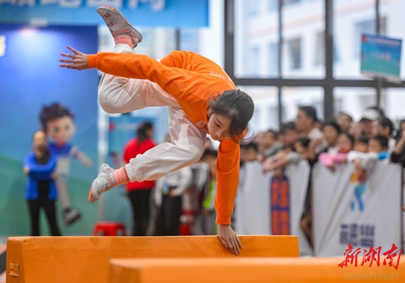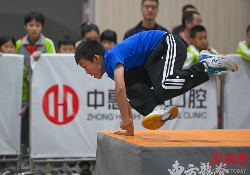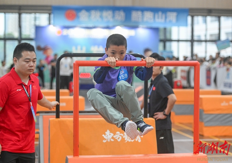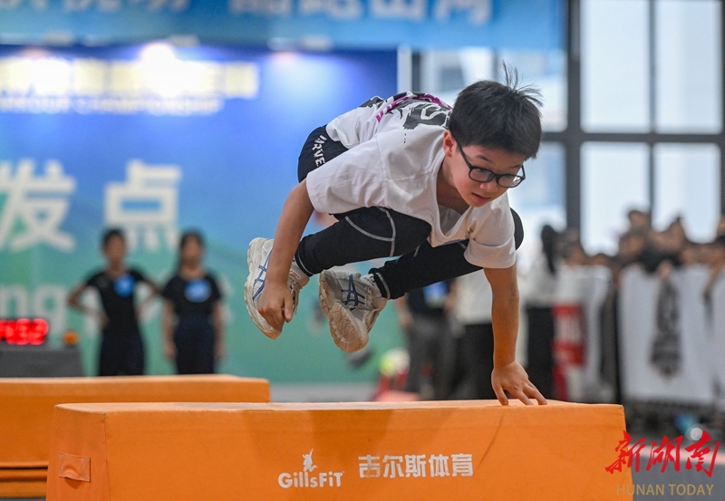 10月18日,小选手在比赛中翻越障碍。当天,2025年湖南省跑酷冠军赛在长沙市开福区新竹第二小学开赛。赛事设专业组与公开组,含个人、团体及亲子项目。大赛吸引了240余名跑酷爱好者参与,为观众带来了一场精彩纷呈的运动赛事。湖南日报全媒体记者 郭立亮 通讯员 刘艳丽 摄影报道