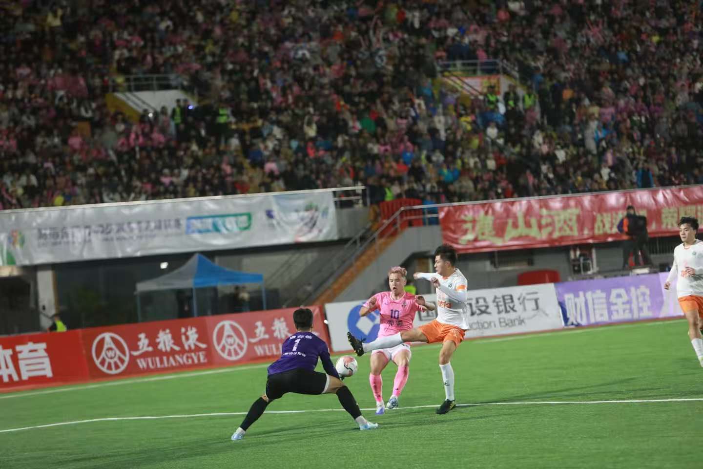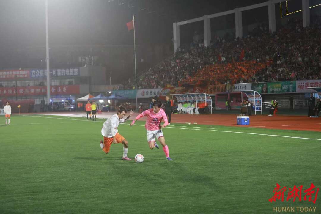 10月18日晚,常德市体育中心,球员在比赛中激烈拼抢。当晚,湘超联赛第六轮比赛,常德队坐镇主场迎战邵阳队,最终两队2比2握手言和。常马 摄(湖南图片库)