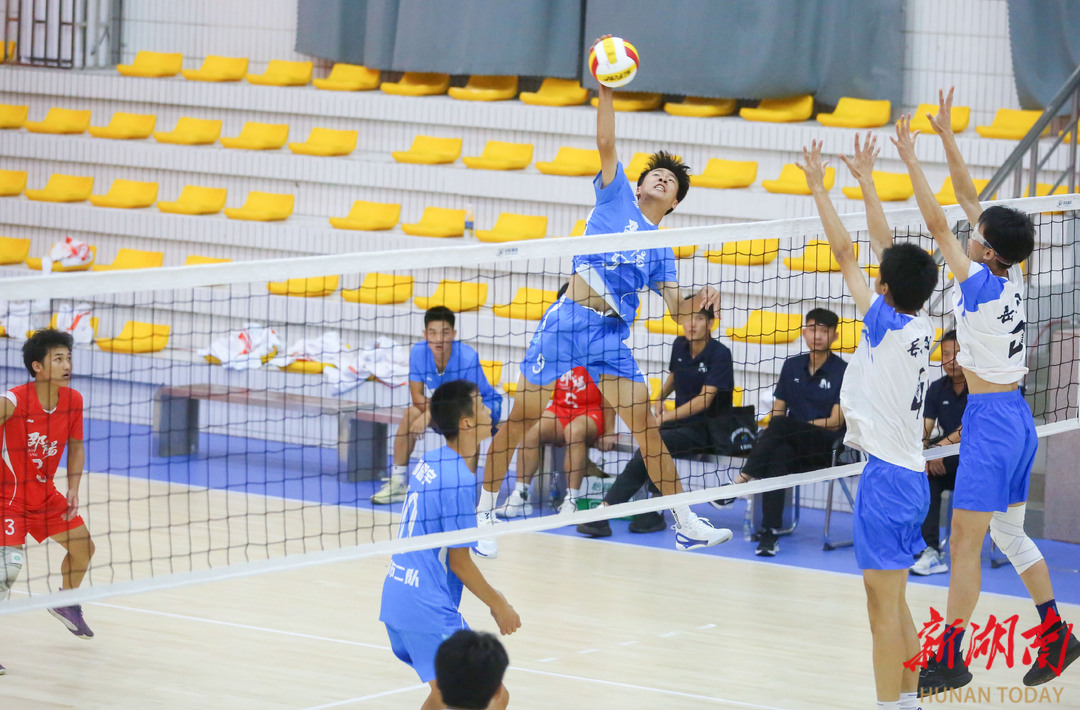 10月18日,邵阳市隆回县第二中学,邵阳一队(蓝)与郴州队在比赛中。当天,湖南省第六届中学生运动会排球比赛在隆回县开赛。曾勇 胡权 摄影报道(湖南图片库)